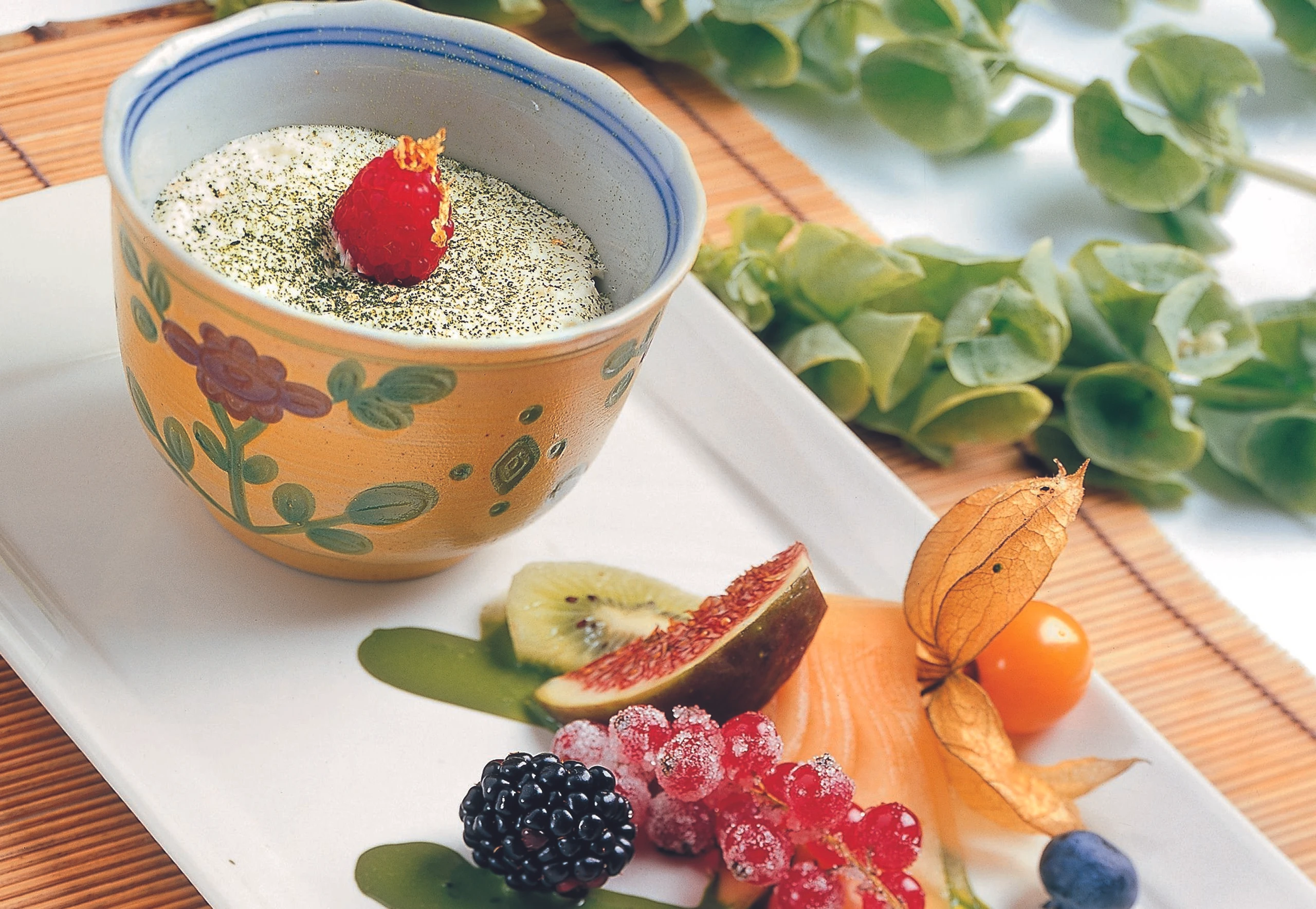 Creme mit Teepulver bestreuen, mit Früchten und evtl. Blattgold dekorieren und mit der Sauce servieren.