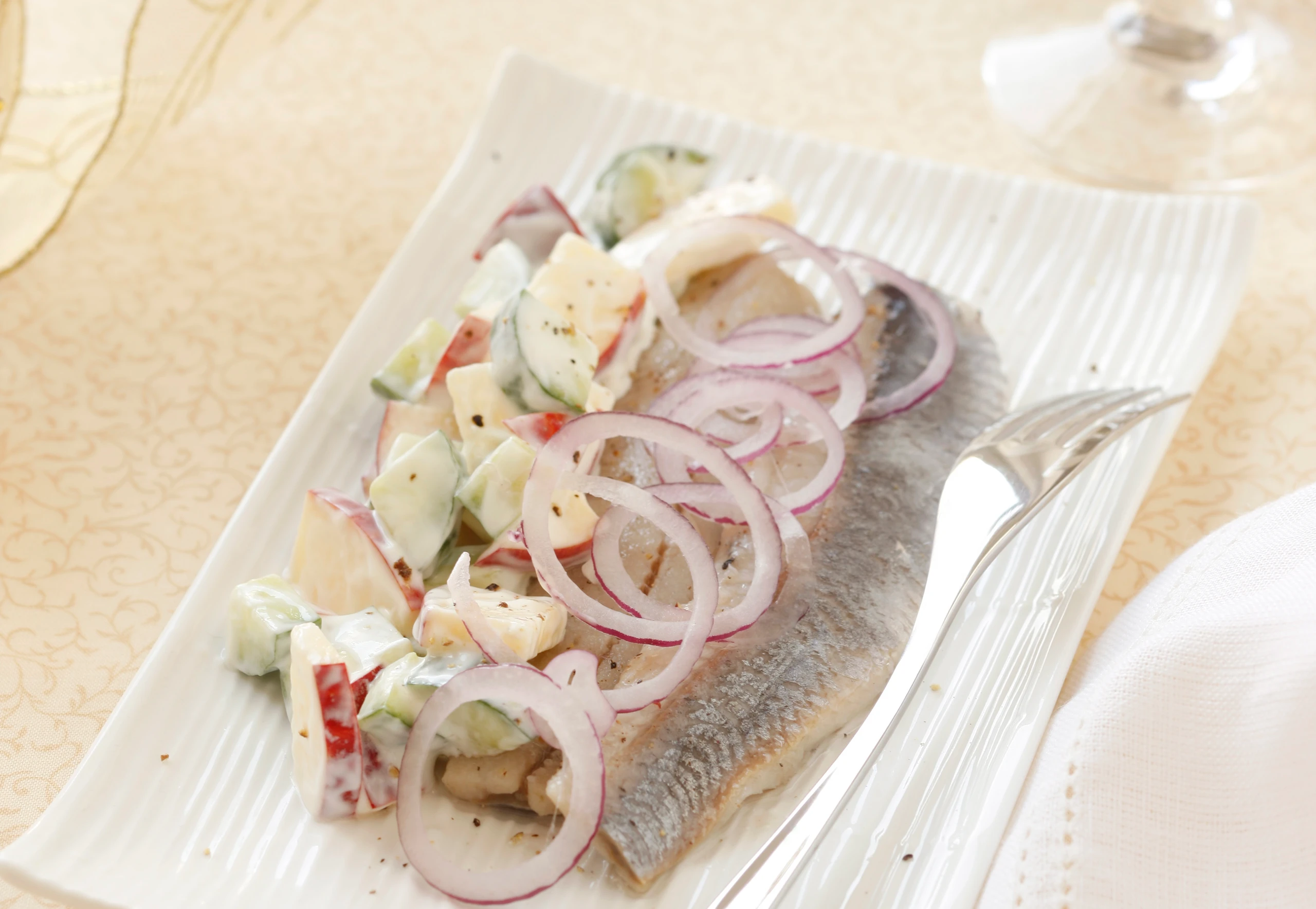 Matjesfilets mit dem Apfel-Gurkensalat anrichten, mit Zwiebelringen garnieren.