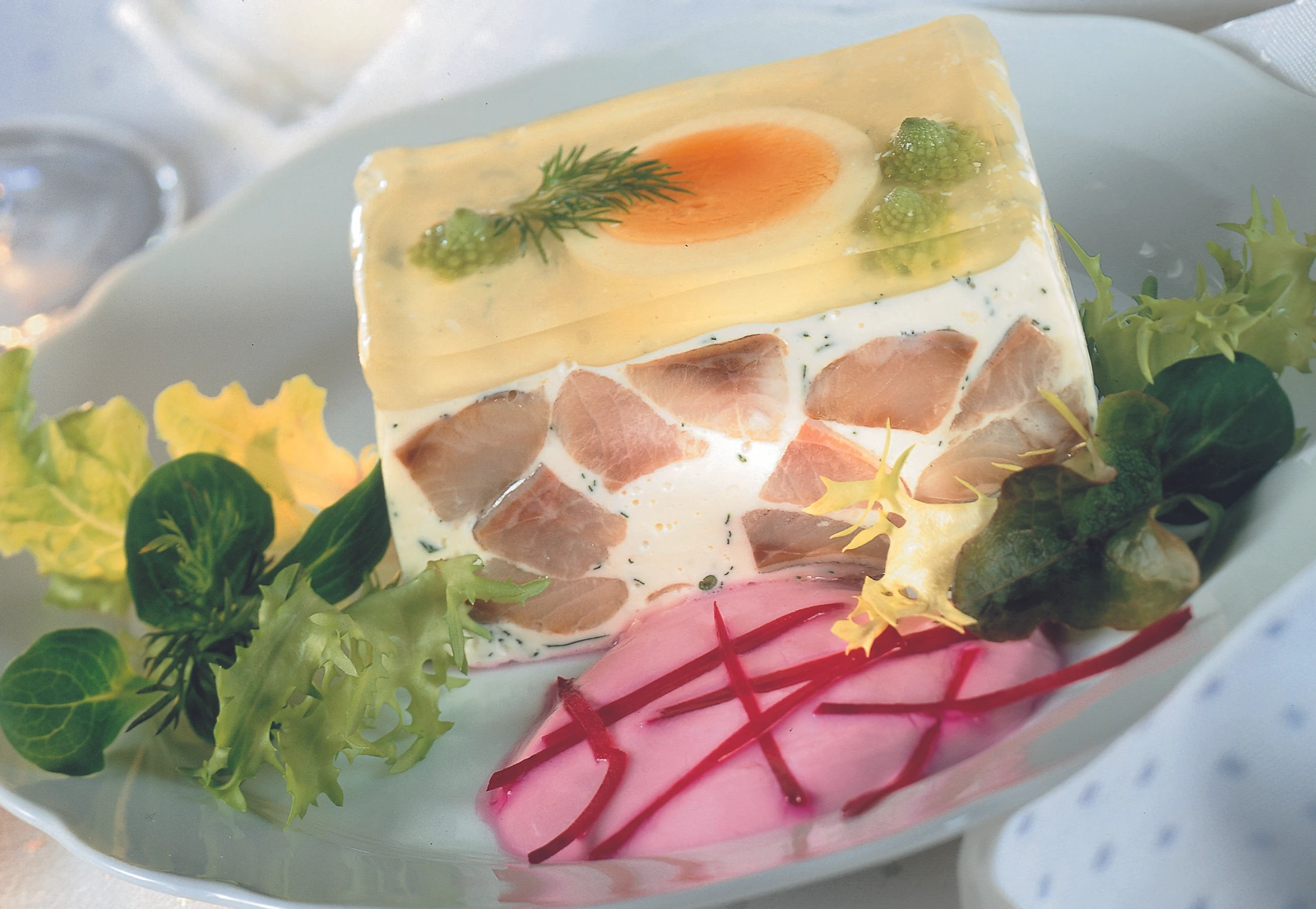 Terrine vor dem Servieren stürzen, Frischhaltefolie abziehen. Terrine behutsam wenden, in gleichdicke Scheiben schneiden, mit Roter Rübensauce und eventuell mit Blattsalaten garnieren.