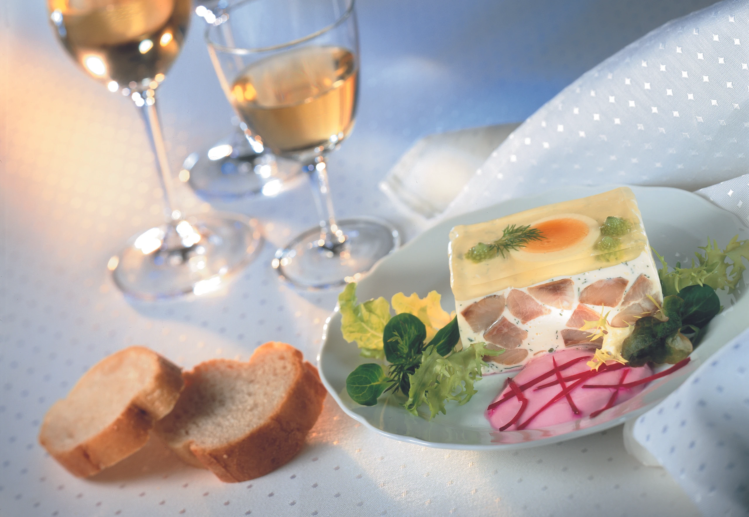 Das noch flüssige Gelee auf die Terrinenoberfläche gießen. Terrine mit Frischhaltefolie zudecken und zum Festwerden in den Kühlschrank stellen (dauert mindestens 2 Stunden).