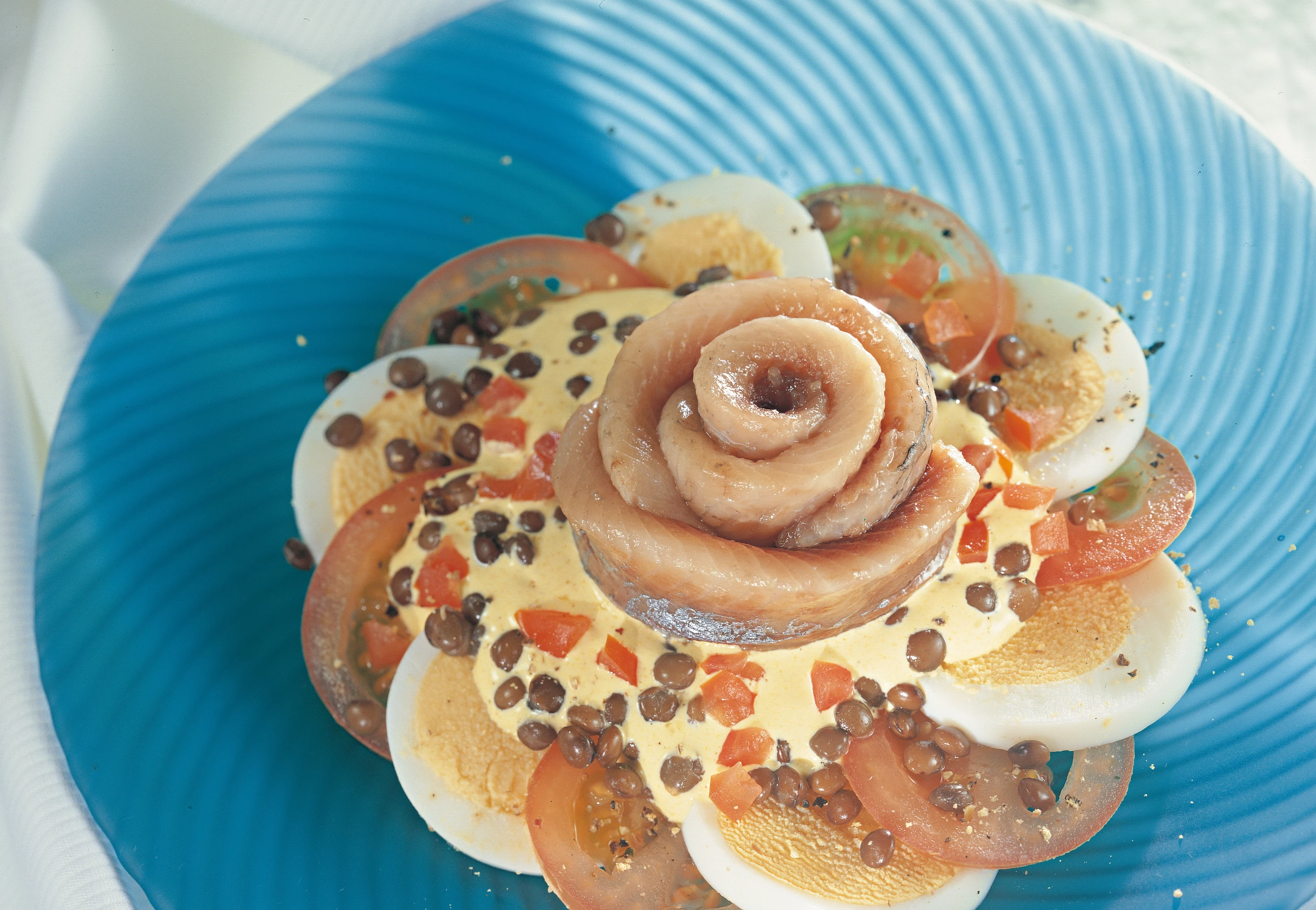 - Linsen und Paradeiswürfel in die Sauce mischen. Paradeiser- und Eischeiben abwechselnd kreisförmig auf Tellern anrichten. Sauce und Matjesfilets jeweils dekorativ in der Mitte anrichten und mit frisch geriebenem Pfeffer bestreuen.