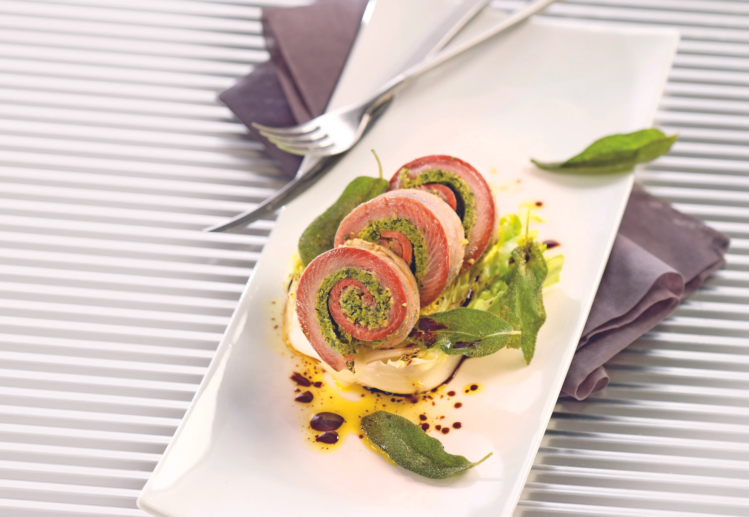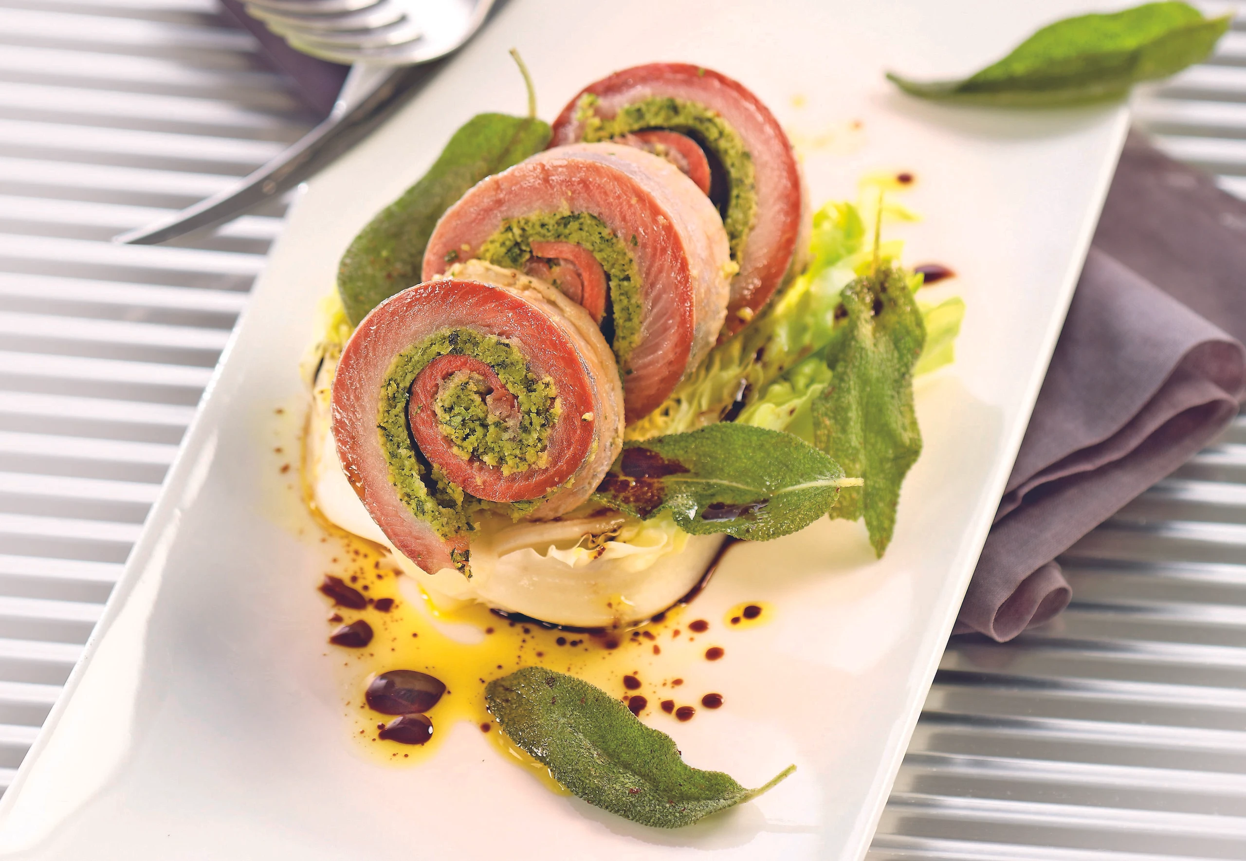 Salbeiblätter abzupfen und in Butter kurz knusprig braten; auf den Matjesröllchen anrichten.