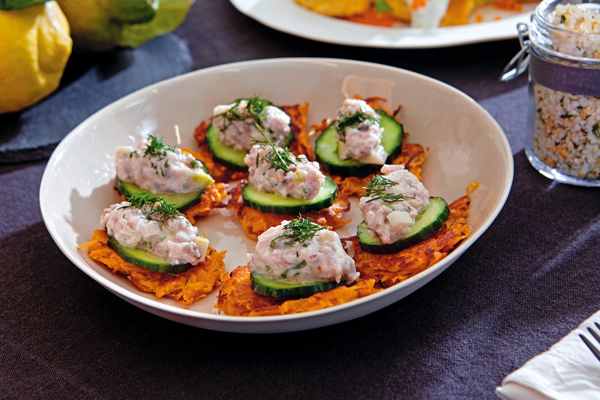 Matjestatar auf Gurken und Süßkartoffelpuffern
