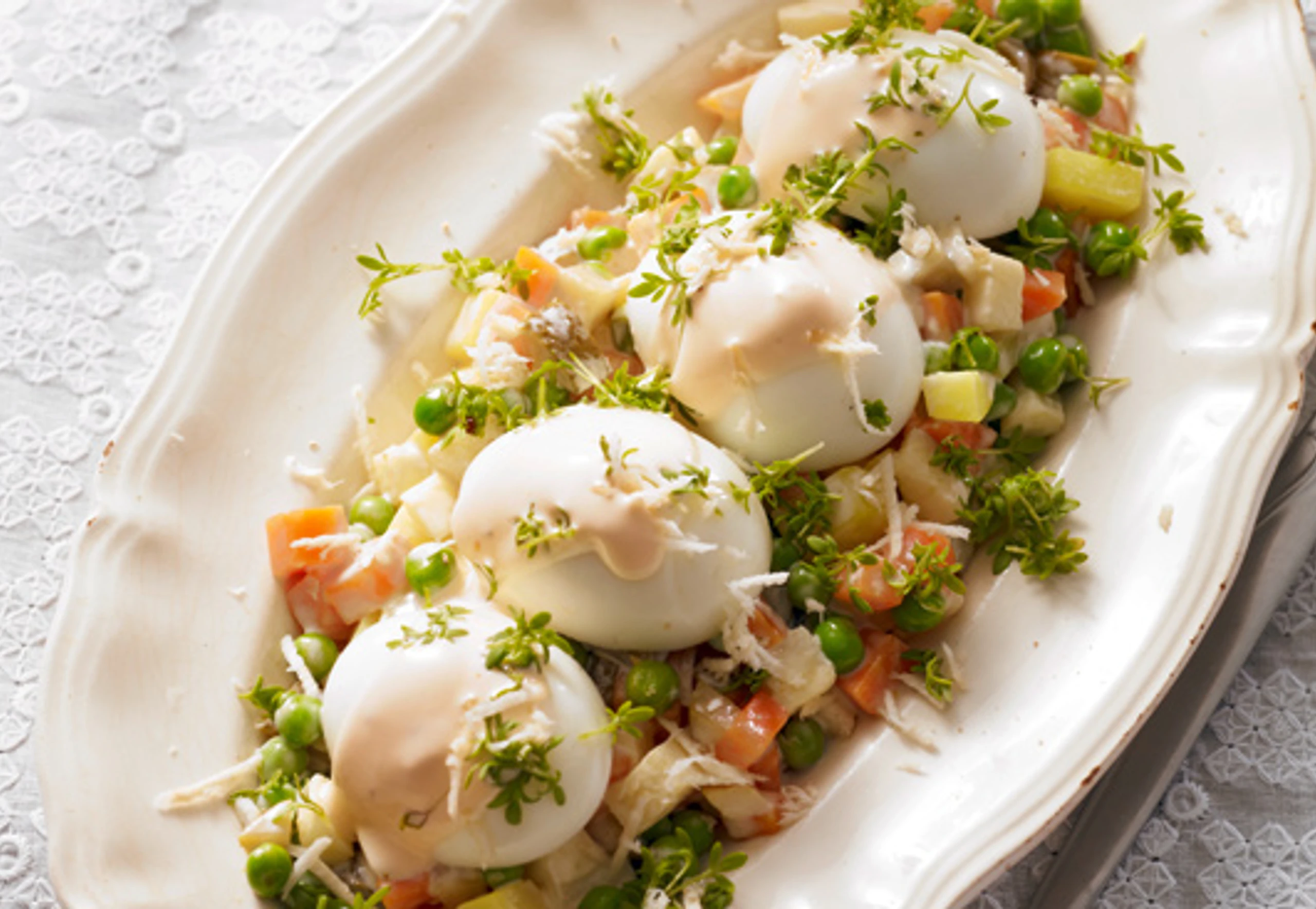 Eier hart kochen, abschrecken, schälen und längs halbieren. Gemüsesalat auf Tellern anrichten, Eierhälften darauf setzen. Eier mit Sauce überziehen und mit Kresse und Kren bestreut servieren.