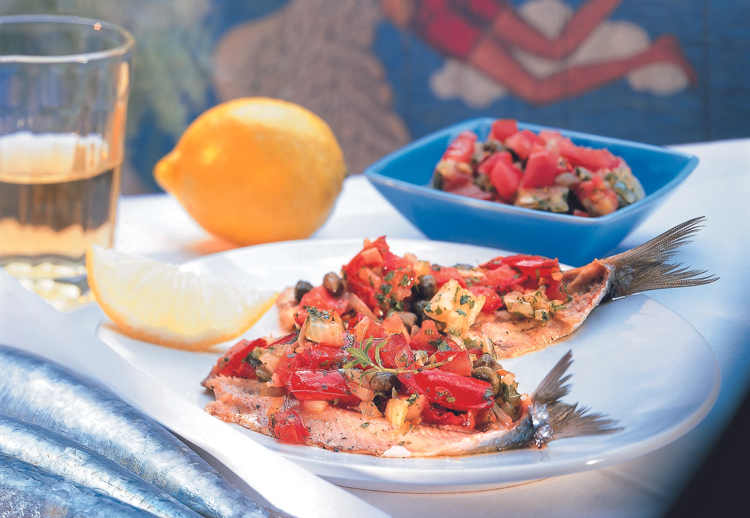 Backrohr auf 180 °C vorheizen, ein Backblech mit Olivenöl bestreichen. Sardinen salzen, pfeffern, mit der Tomatenmischung belegen und mit dem restlichen Olivenöl beträufeln. Sardinen auf das Blech legen und im Rohr ca. 15 Minuten braten.