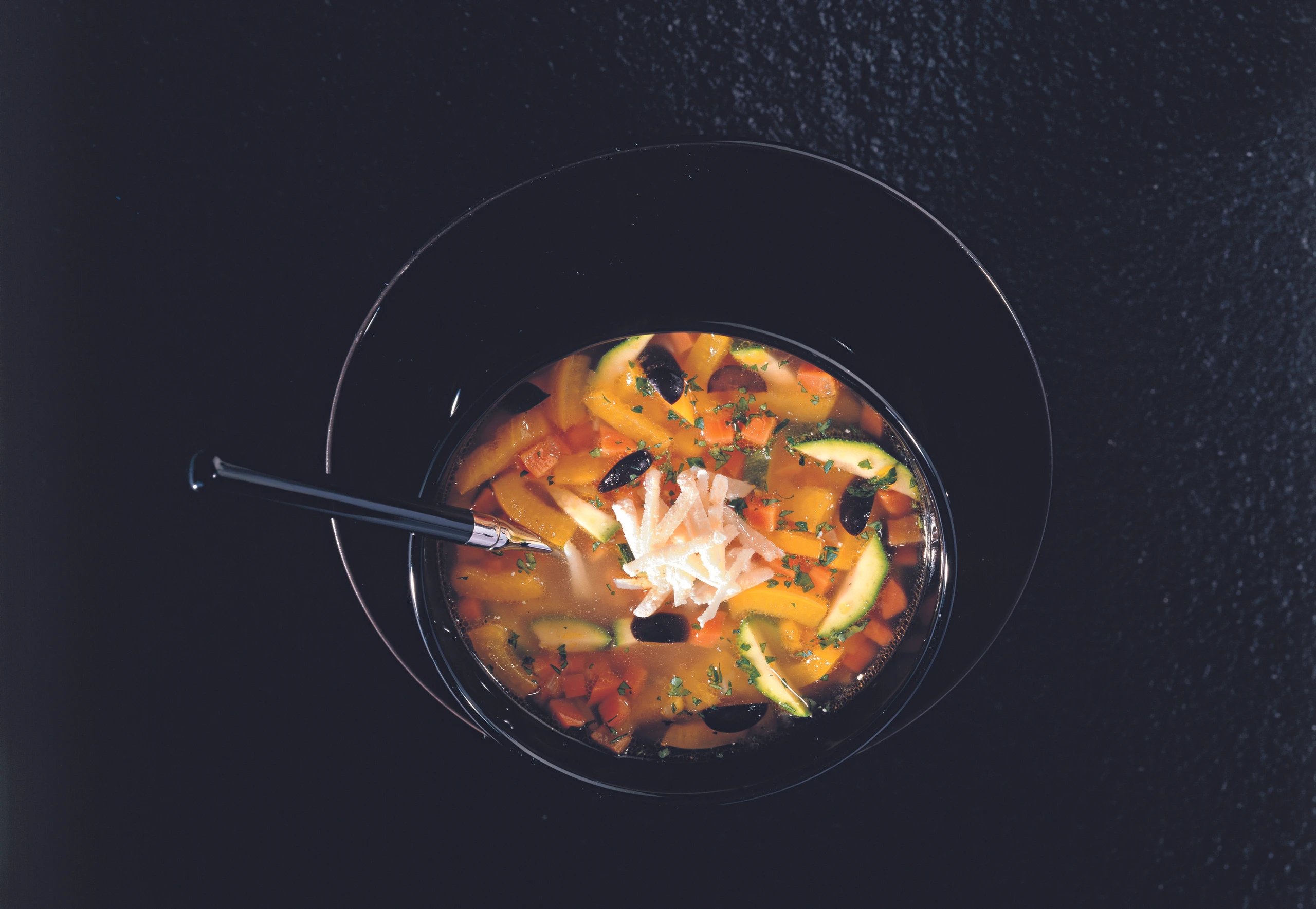 Zucchini untermischen. Suppe mit Salz, Pfeffer und zerdrücktem Knoblauch würzen und weitere 2 Minuten kochen, Kräuter und Oliven untermischen. Suppe mit Parmesan bestreut servieren. Dazu paßt am besten Weißbrot.