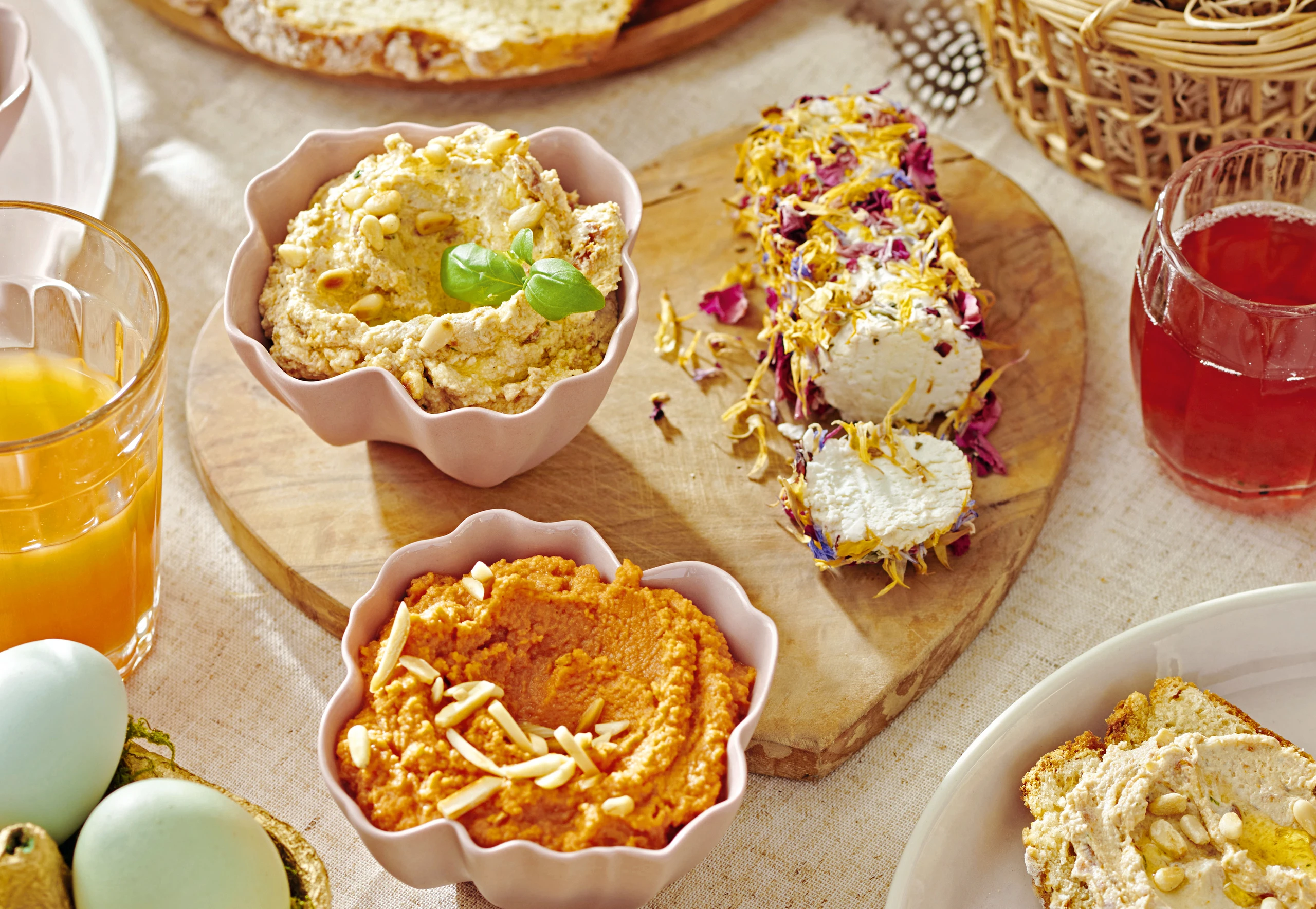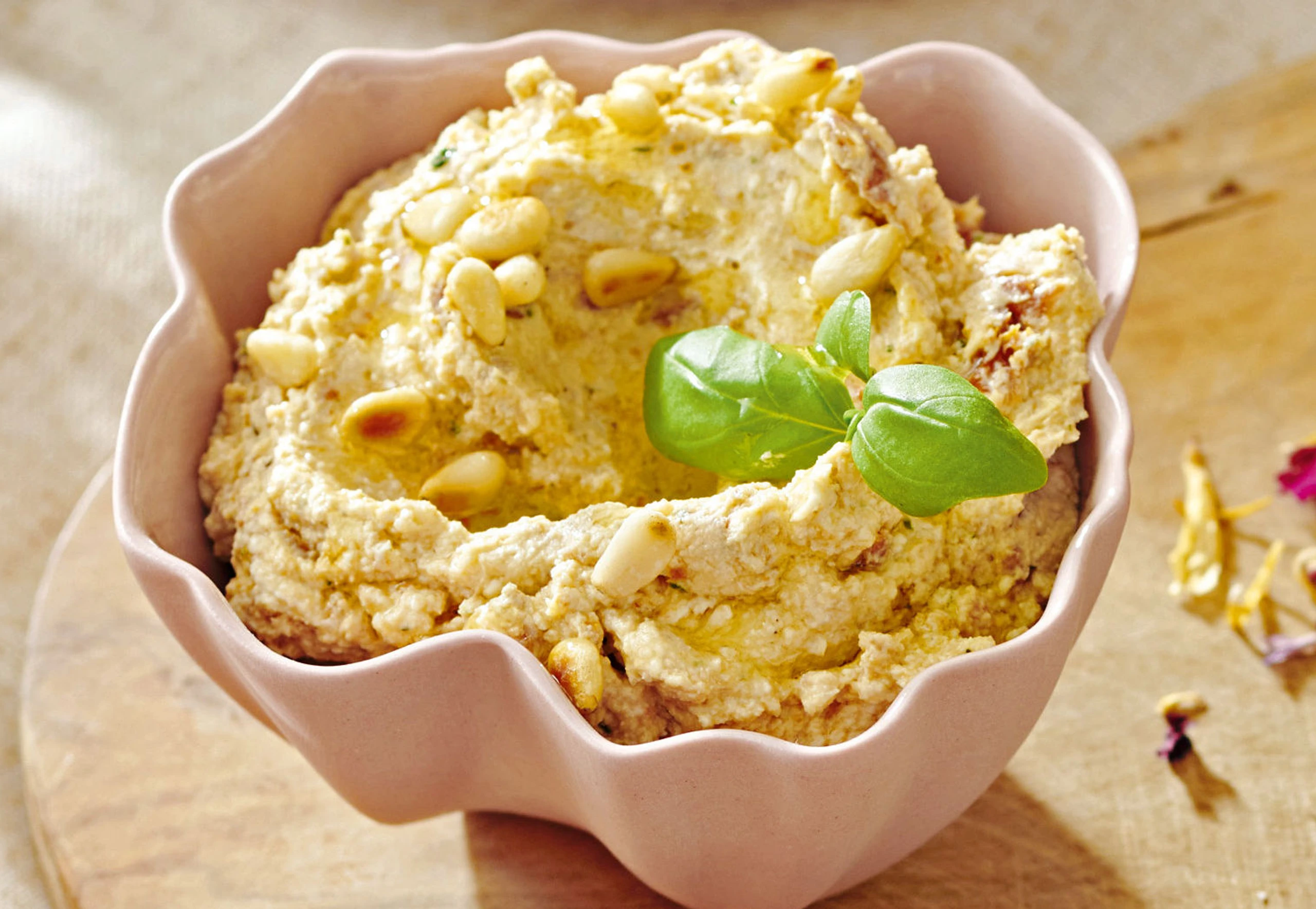 Je 1 EL Pignoli und Basilikumblättchen für die Deko beiseite stellen. Übrige Pignoli, Kräuter und Paradeiser sehr fein hacken. Feta zerbröseln. Alle Zutaten mit 2 EL vom Paradeiseröl (aus dem Glas der eingelegten Paradeiser) verrühren. Mit Salz und Pfeffer abschmecken. Aufstrich mit Pignoli und Basilikum garnieren.