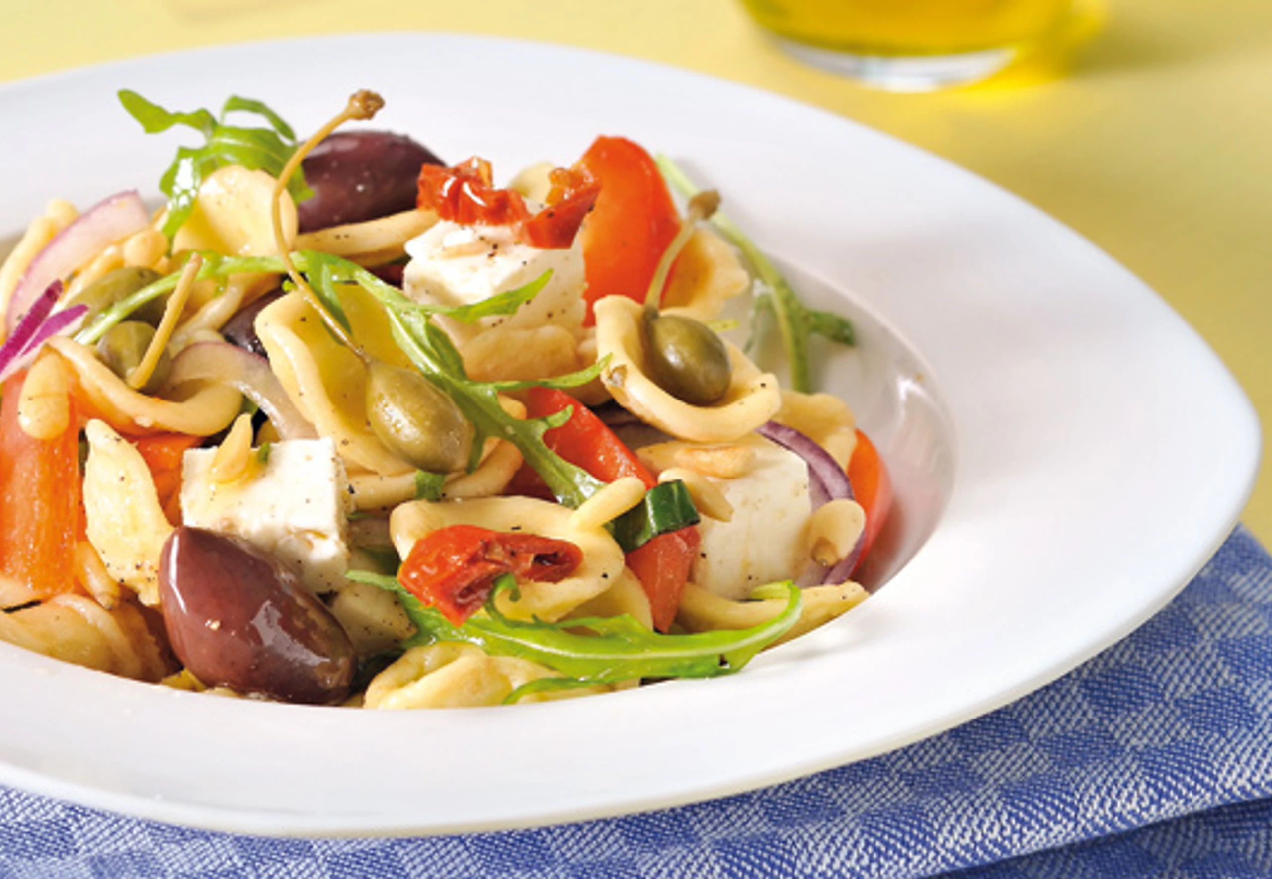 Pasta abseihen, abtropfen lassen und in eine Schüssel geben. Zwiebel, Paprika, Schafkäse, Pinienkerne, Oliven, Kapern und Paradeiser untermischen. Salat mit Öl und Balsamico marinieren. Zuletzt Rucola zugeben. Salat salzen, pfeffern und mit Basilikum bestreut servieren.