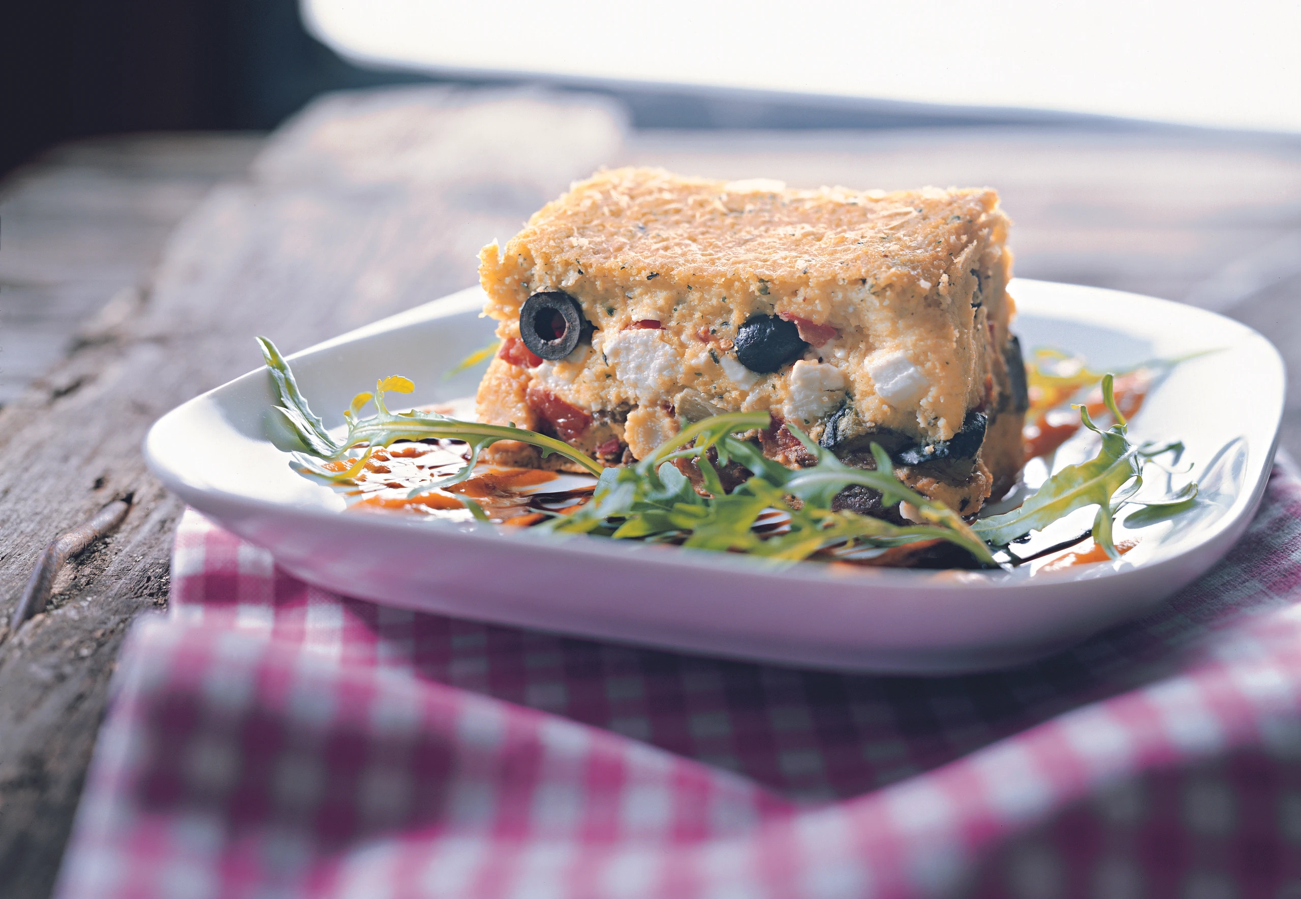 Rohr auf 180°C vorheizen. Kastenform (24 x 10 cm) mit Butter ausstreichen. Ein Drittel der Polenta einfüllen. Gemüse darauf legen, salzen und pfeffern. Zweites Drittel der Polenta darauf verteilen, mit der Käsemischung bestreuen und mit übriger Polenta bestreichen. Auflauf mit Parmesan bestreuen und im Rohr (mittlere Schiene / Gitterrost) ca. 40 Minuten backen. Mit der Sauce servieren.