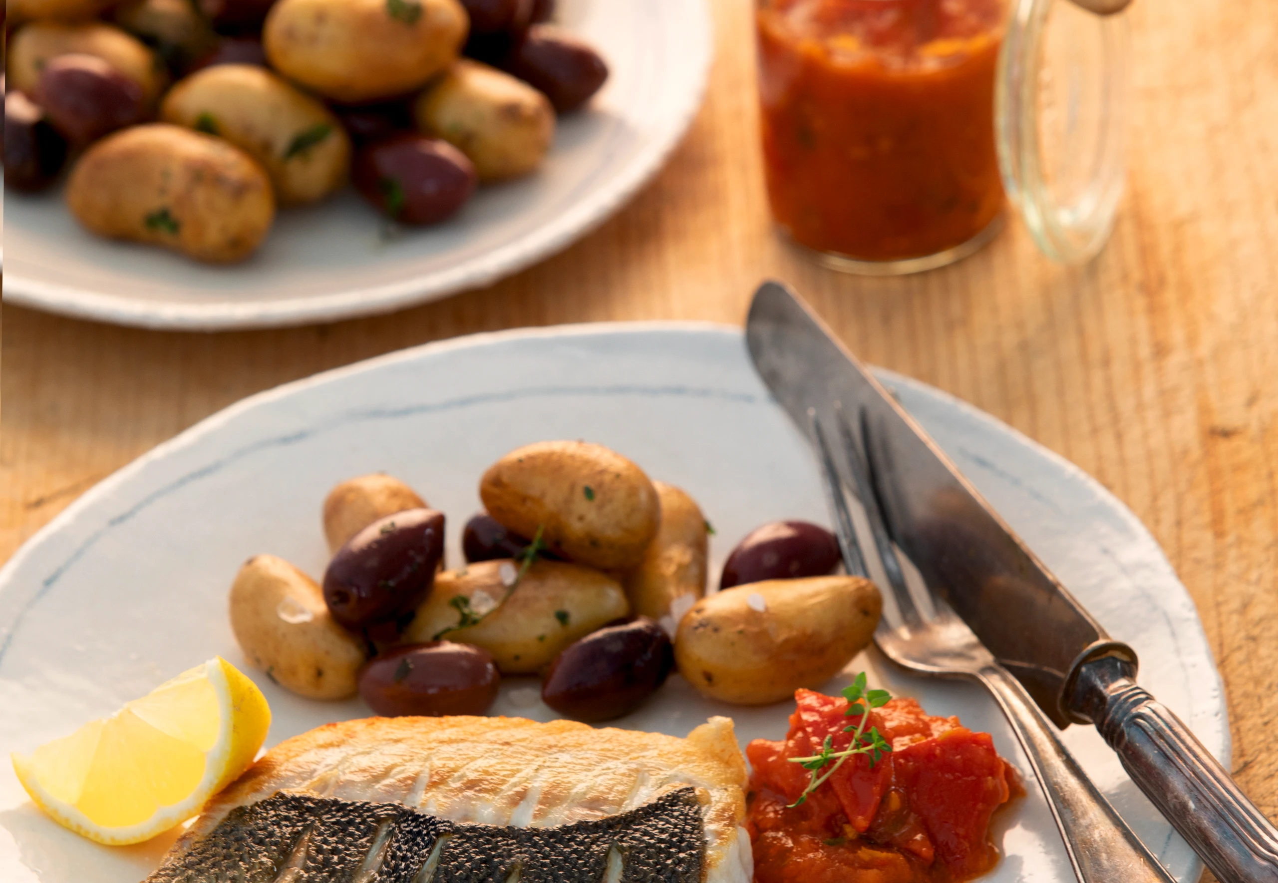 - Fischfilets mit dem Paradeiserkonfit und der Erdäpfel-Olivenmischung anrichten. Eventuell Zitronenspalten dazu reichen.