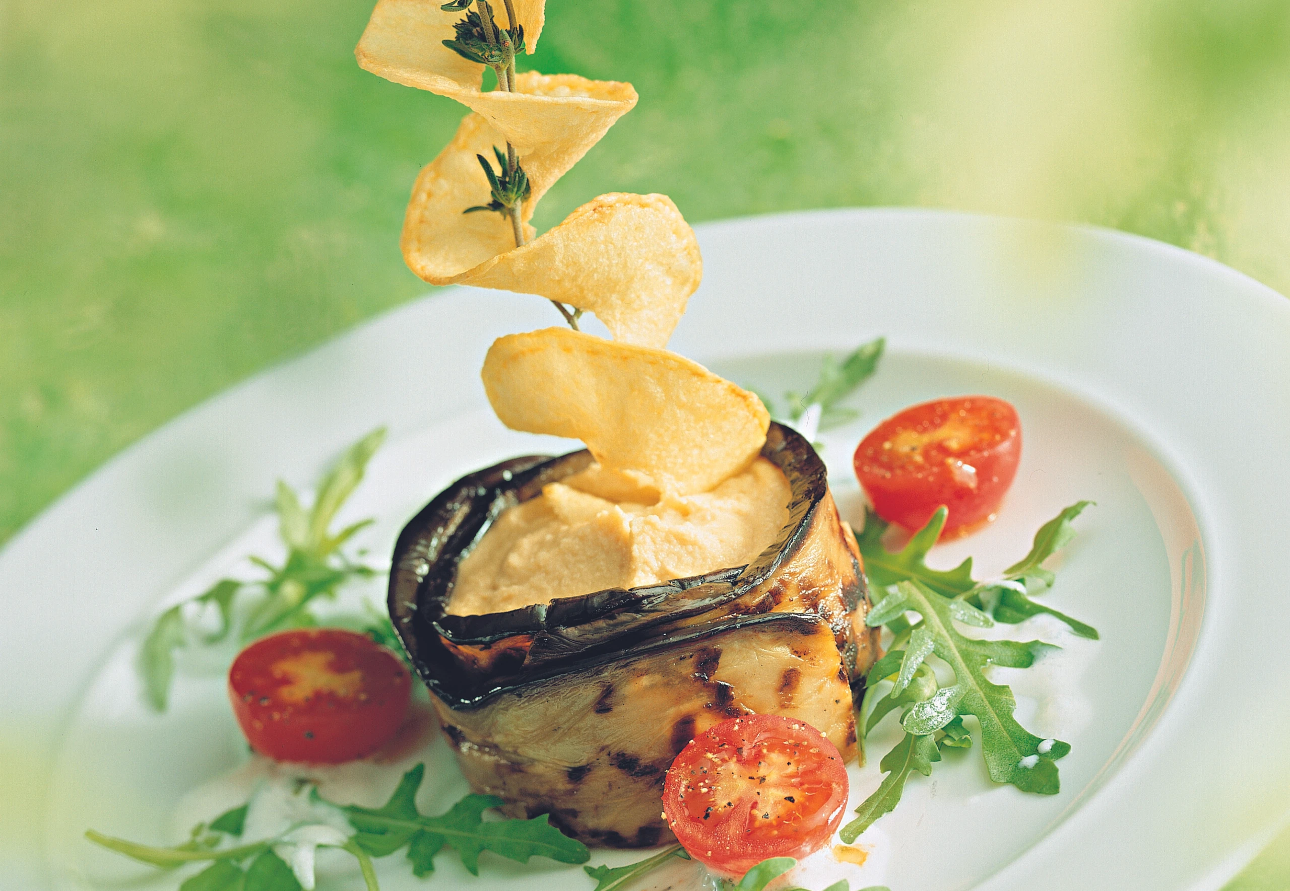 Zum Anrichten einen glatten Ausstecher (Ø 8 cm) auf einen Teller setzen und innen mit 2 Melanzanescheiben auslegen (gerade Seite unten und versetzt, so dass sie ca. um die Hälfte überlappen). Ein Viertel vom Kichererbsenmus hinein füllen, Ausstecher behutsam abheben. Die 3 weiteren Portionen ebenso anrichten.