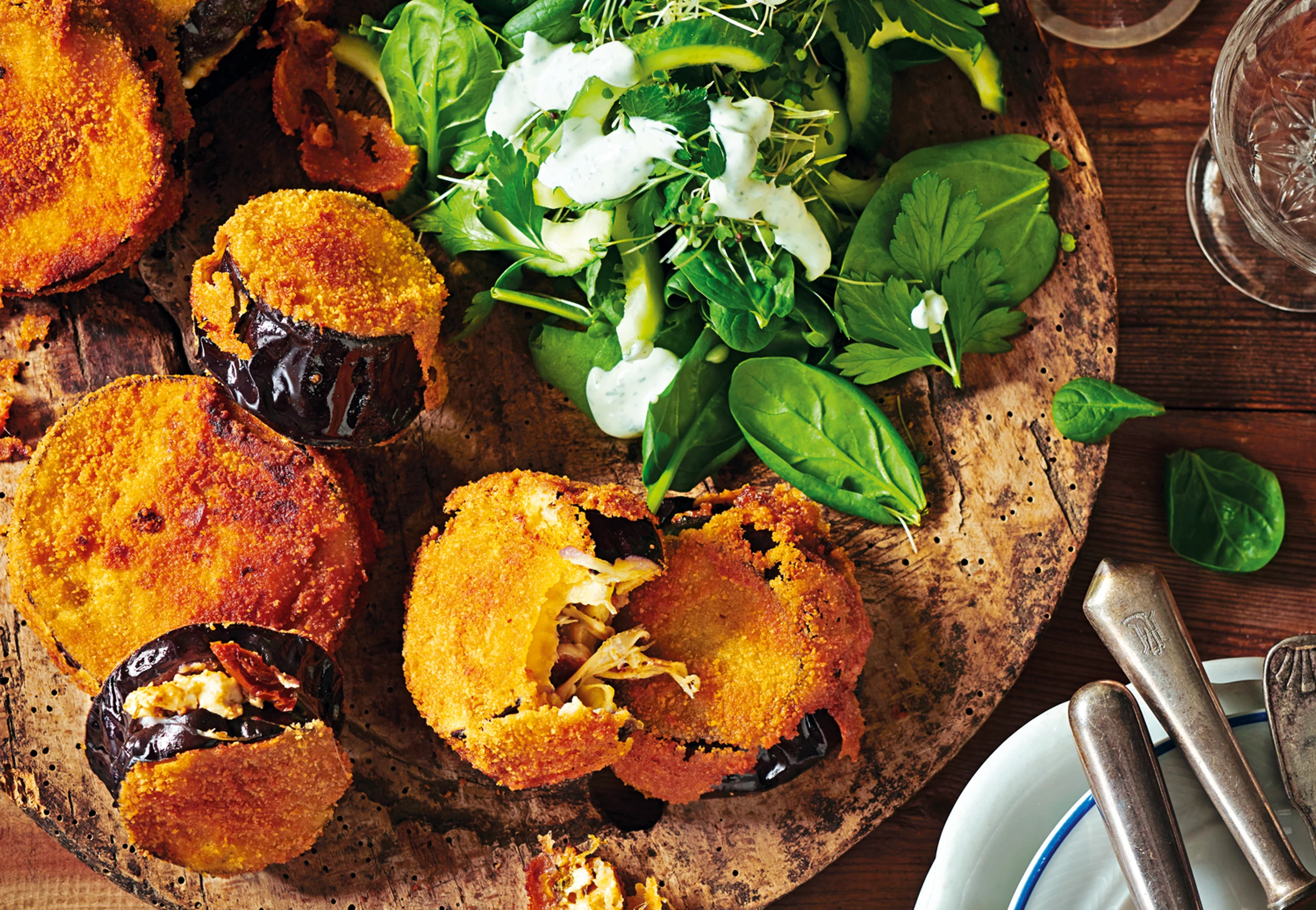 Für den Salat Joghurt, Dille und Zitronensaft pürieren. Dressing mit Salz und Pfeffer würzen. Gurke halbieren und die Kerne mit einem Löffel herausschaben. Gurke in Scheiben schneiden. Spinat, Kresse, Petersilie und Gurke vermischen. Salat mit dem Dressing beträufeln. Melanzani-Cordon-bleu mit dem Salat servieren.