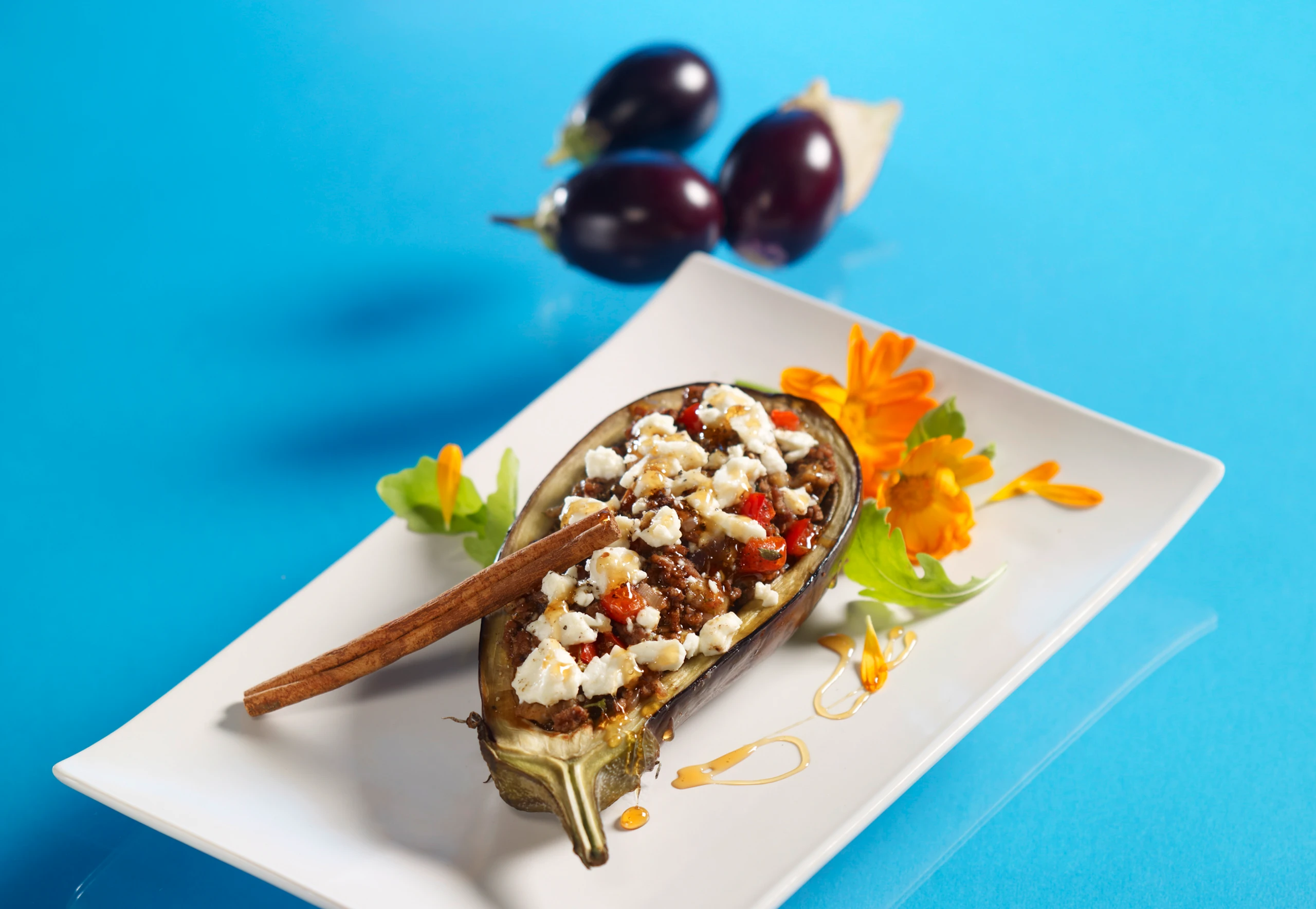 - Rohr auf Grillstellung schalten. Melanzani-Hälften füllen, Feta darauf verteilen. Auflaufform mit Öl bestreichen, Melanzani hineinlegen und im Rohr (mittlere Schiene / Gitterrost) ca. 10 Minuten überbacken. Melanzani mit Honig beträufeln und eventuell mit Rucola und Ringelblumen garniert servieren.