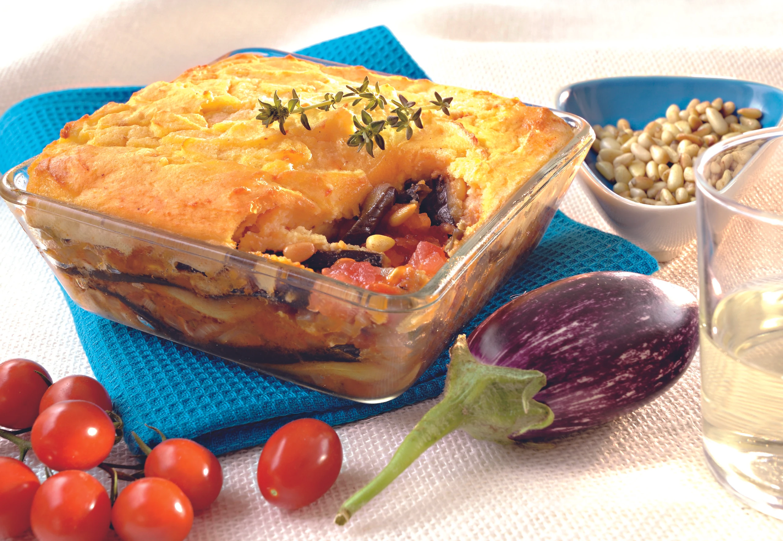 Pignoli in einer trockenen Pfanne unter Rühren kurz rösten, auskühlen lassen und grob hacken. Form mit Öl ausstreichen. Melanzani, Pignoli und Sauce einschichten. Erdäpfelmasse darauf streichen. Moussaka ca. 45 Minuten im Rohr backen.