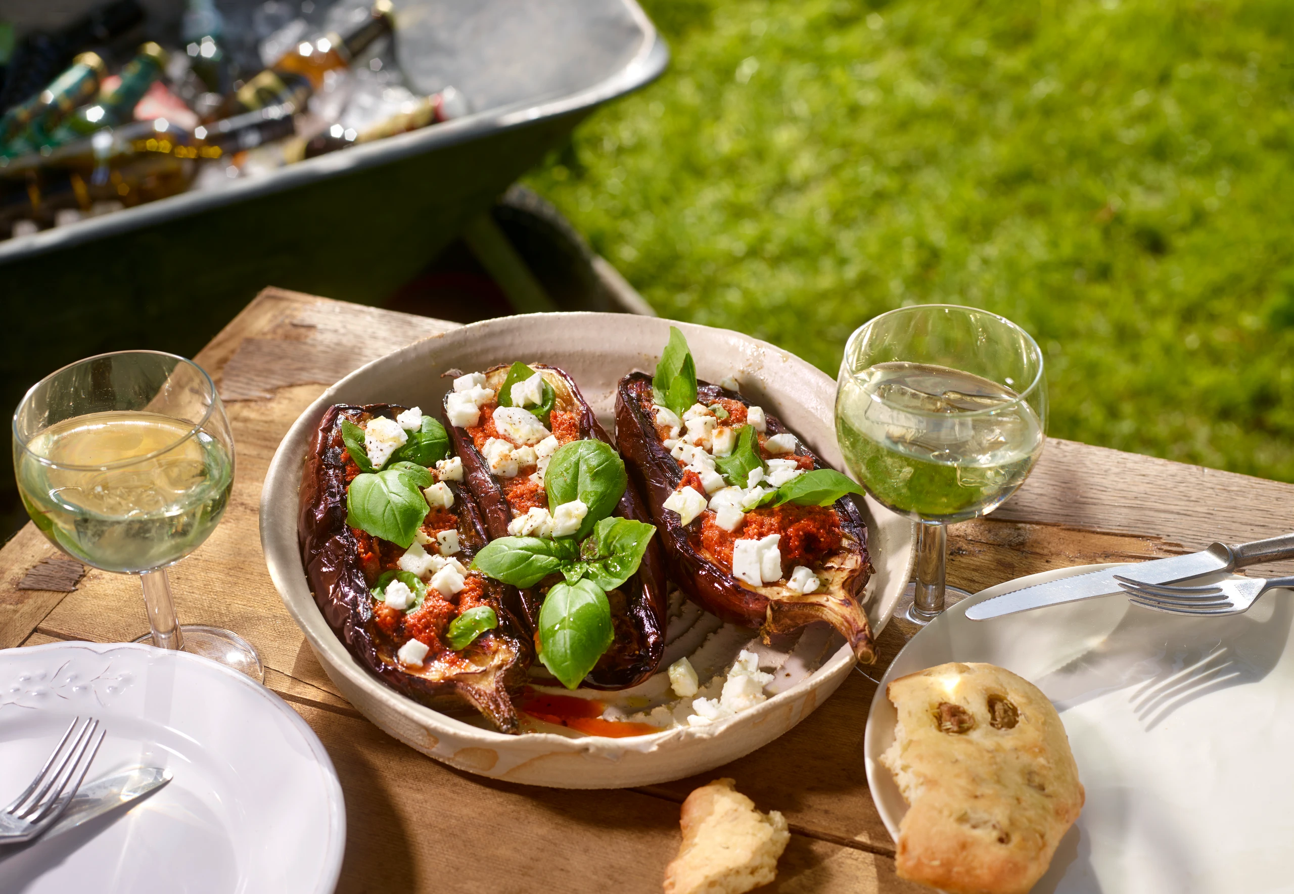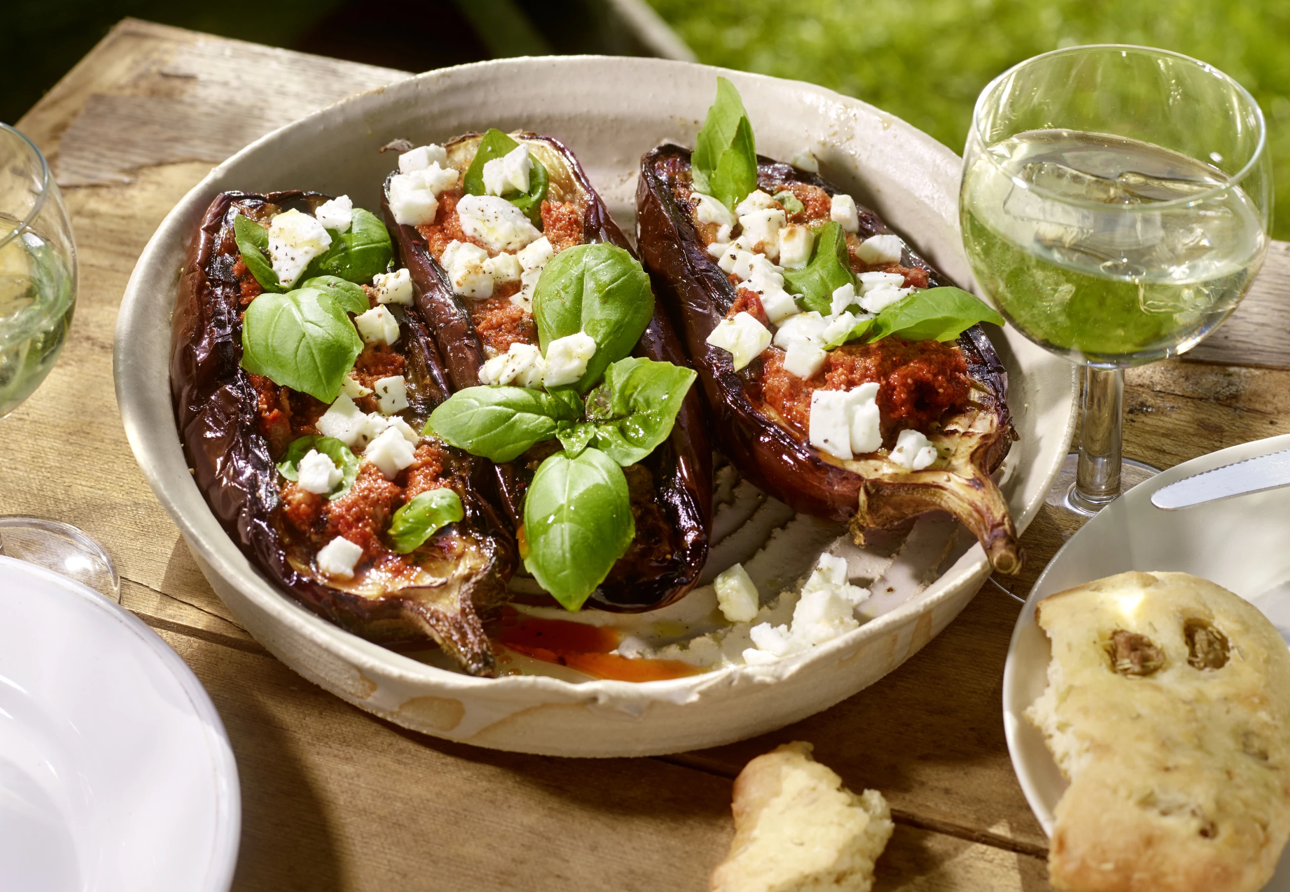 Melanzani mit Paradeis-Nusspesto und Kräuter-Olivenbrot