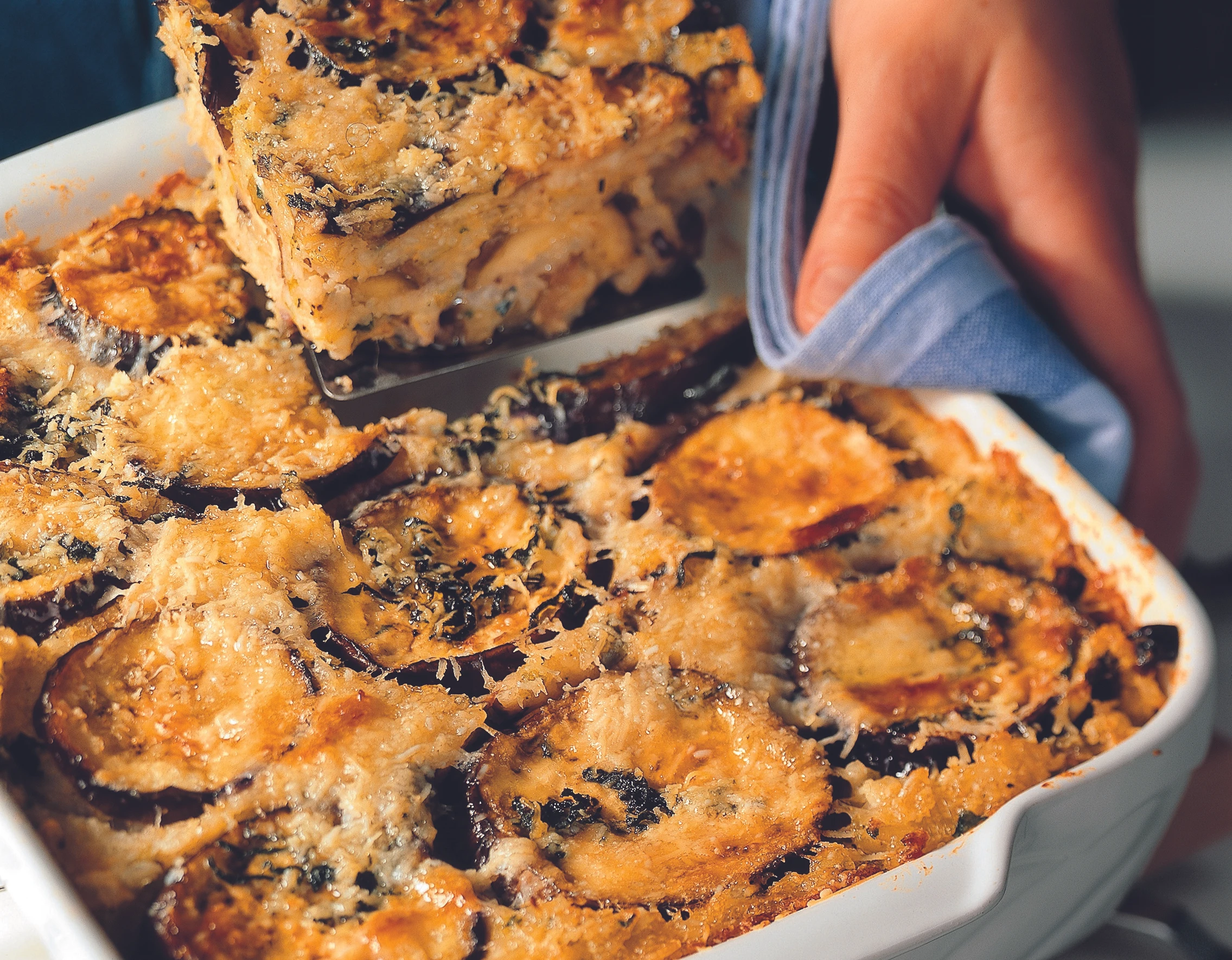 Backrohr auf 180 °C vorheizen. Auflaufform (am besten eckig; Inhalt ca. 11/2 l) mit 1 EL vom Olivenöl ausstreichen und mit einem Drittel der Melanzanescheiben auslegen. Die Hälfte der Reismasse, ein Drittel der Melanzanescheiben, übrige Reismasse und restliche Melanzanescheiben schichtenweise darauf verteilen.