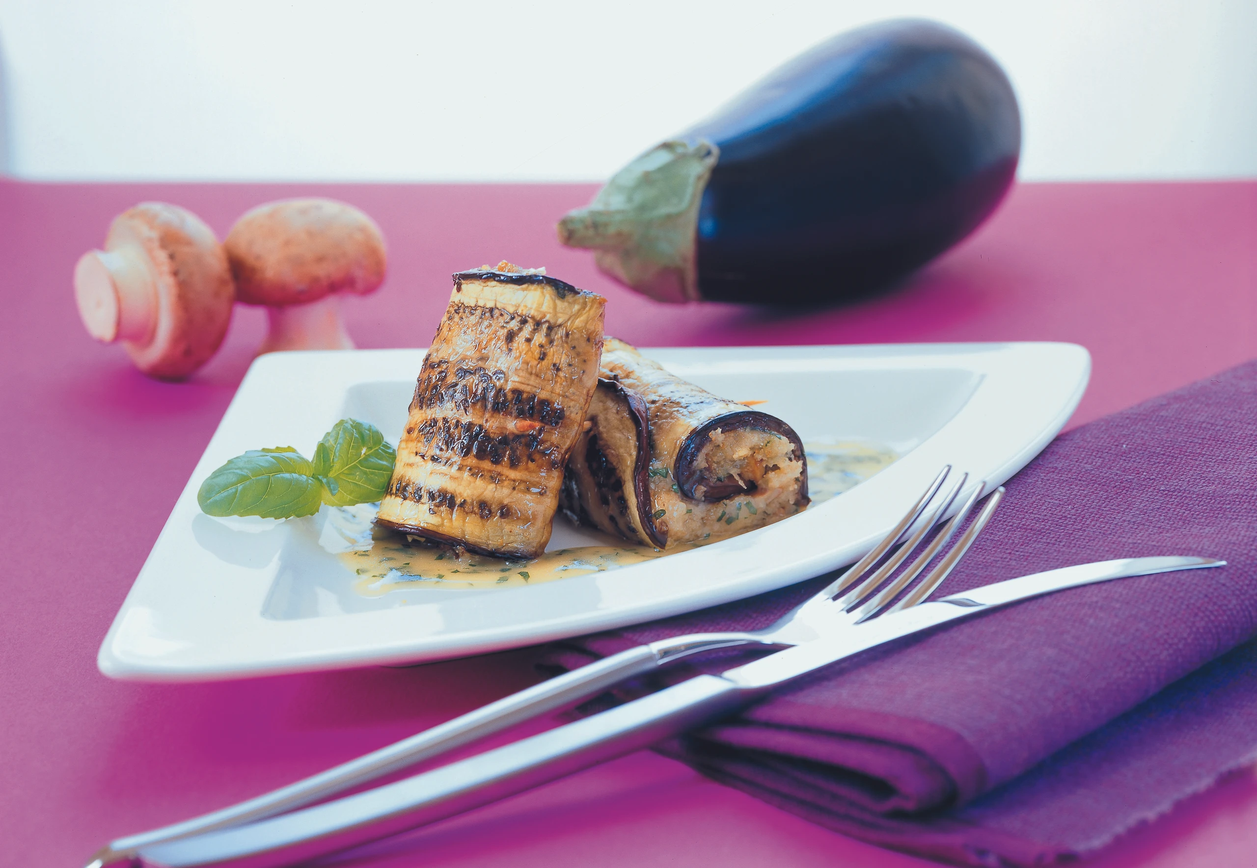 Melanzanischeiben trockentupfen, mit Fülle bestreichen, mit Mozzarella belegen und eng einrollen. Röllchen mit Zahnstochern fixieren, in die Form legen und ca. 30 Minuten im Rohr (mittlere Schiene / Gitterrost) backen.