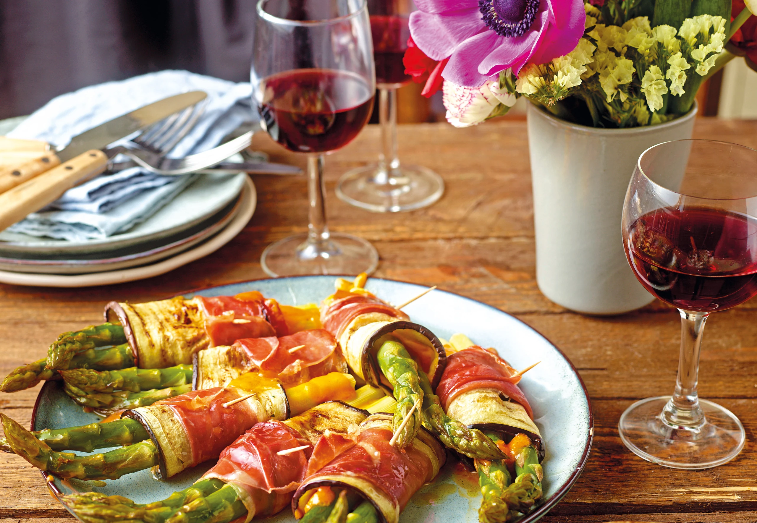 Jede Melanzanischeibe am unteren Ende mit ca. 30 g Cheddar bestreuen, mit 2 Spargelstangen belegen und über die Fülle eng einrollen. Jedes Röllchen mit 2 Scheiben Prosciutto umwickeln und mit Zahnstochern fixieren. Auf das Blech setzen, mit Zitronensaft beträufeln und im Rohr (mittlere Schiene) ca. 15 Minuten backen.