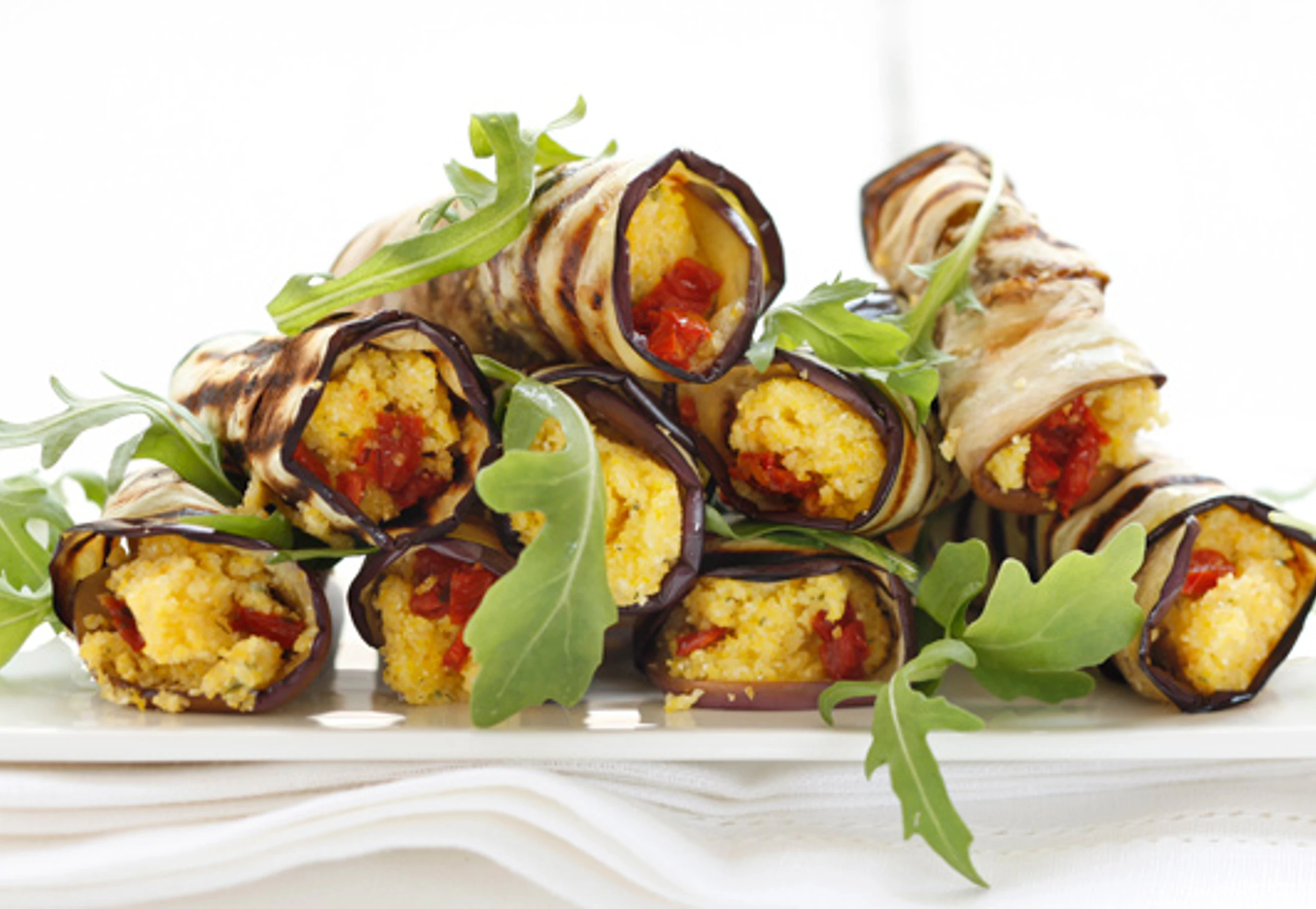 Melanzanischeiben mit der Fülle bestreichen und eng einrollen. Röllchen anrichten und mit Rucola garniert servieren.