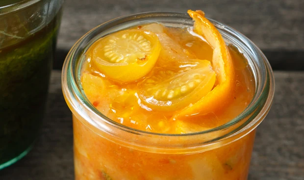 - Mit Essig ablöschen und aufkochen. Paradeiser, Melone, Zucker, Orangenschale, Senfkörner und Cayennepfeffer zugeben und bei mittlerer Hitze einkochen (ca. 45 Minuten). Chutney mit Salz abschmecken, heiß in Gläser füllen und sofort verschließen.