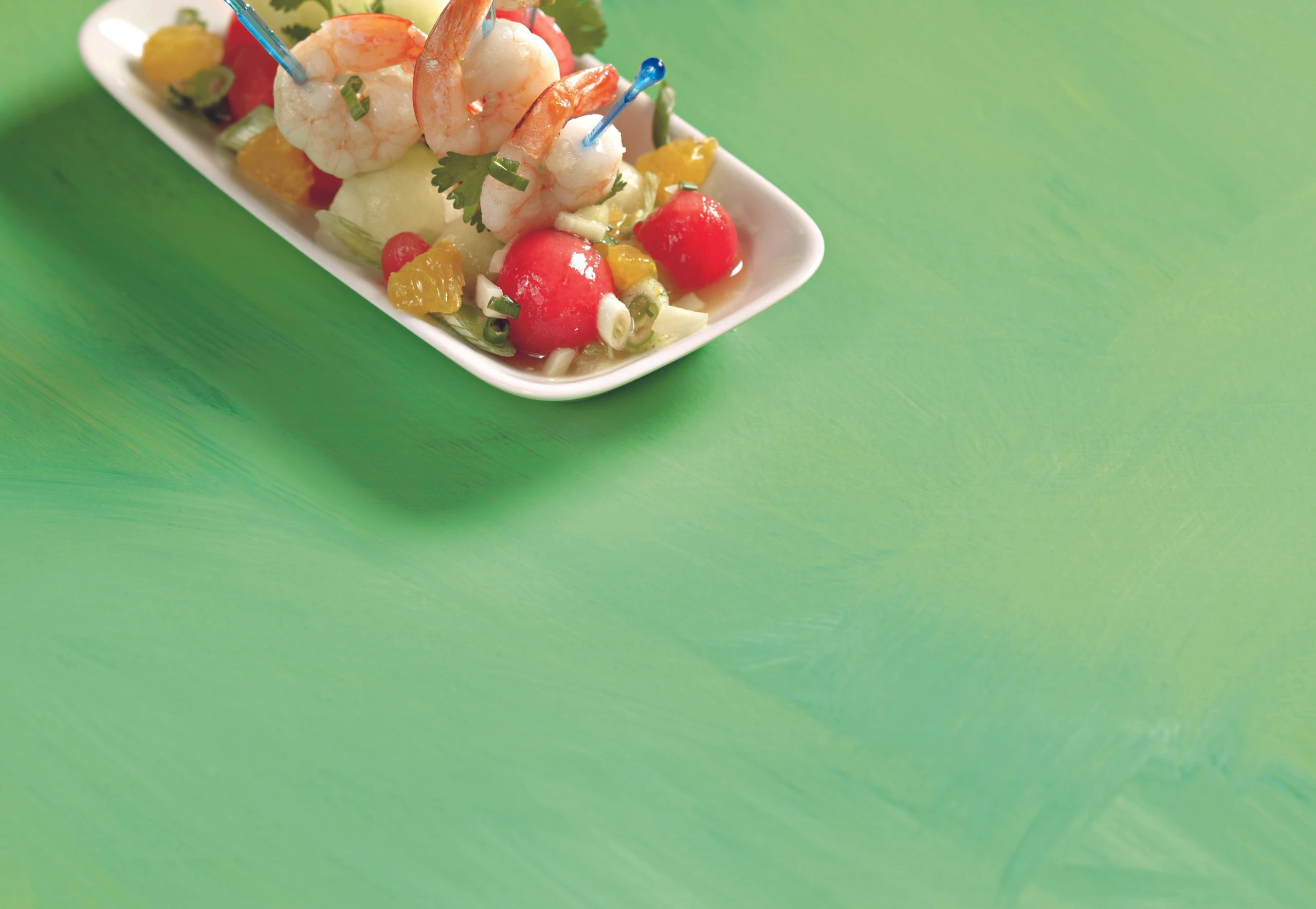 - Garnelen auf Spießchen stecken und auf dem Melonen-Cocktail anrichten.
