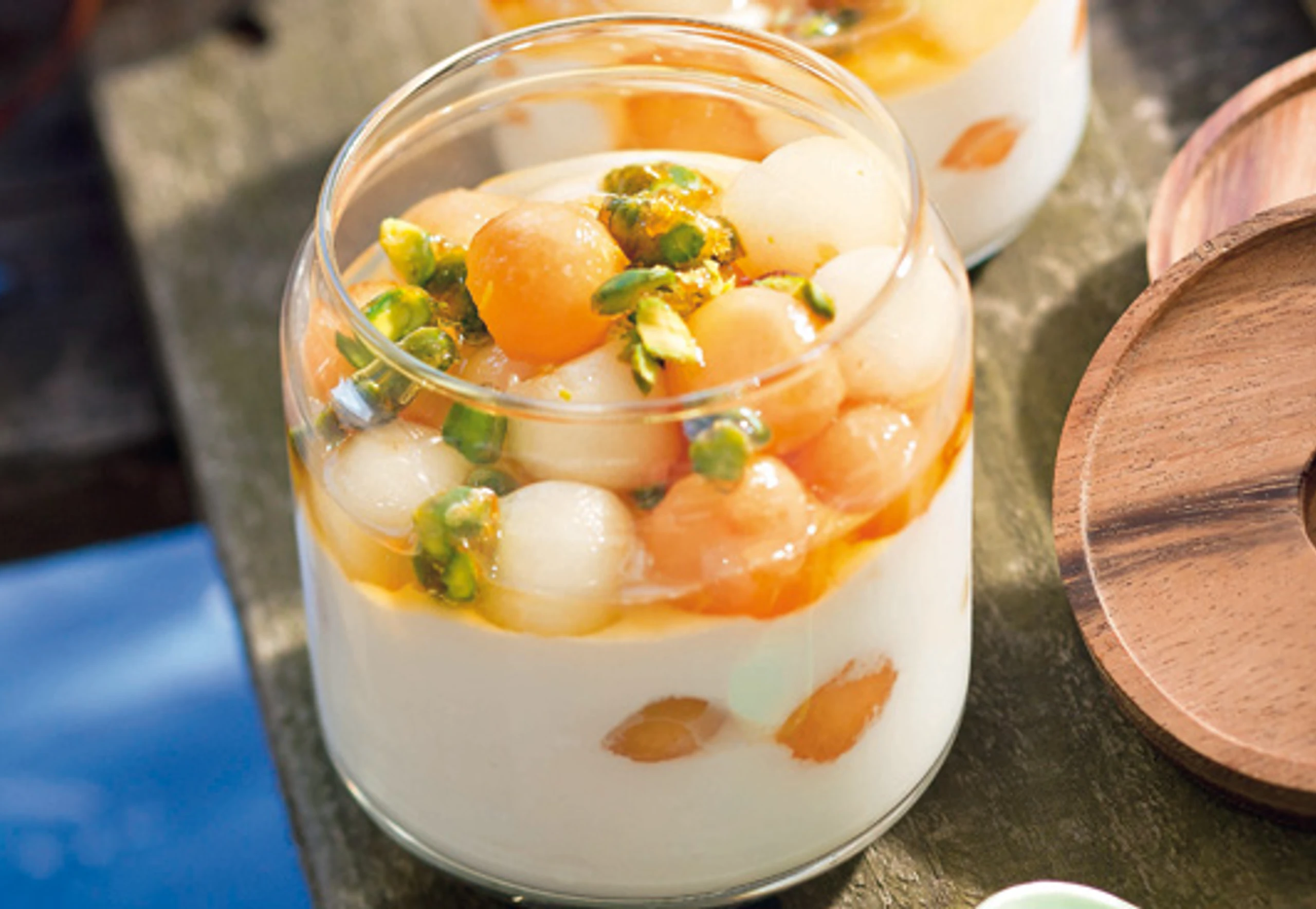 Zucker in einer Pfanne schmelzen und die Pistazien darin karamellisieren. Pistazien auf ein mit Backpapier belegtes Blech leeren, auskühlen lassen und grob hacken. Joghurt und Honig vermischen. Aus den Melonen mit einem Parisiennelöffel kleine Kugeln ausstechen und abwechselnd mit dem Joghurt in verschließbare Gläser füllen. Mit den Pistazien bestreuen.