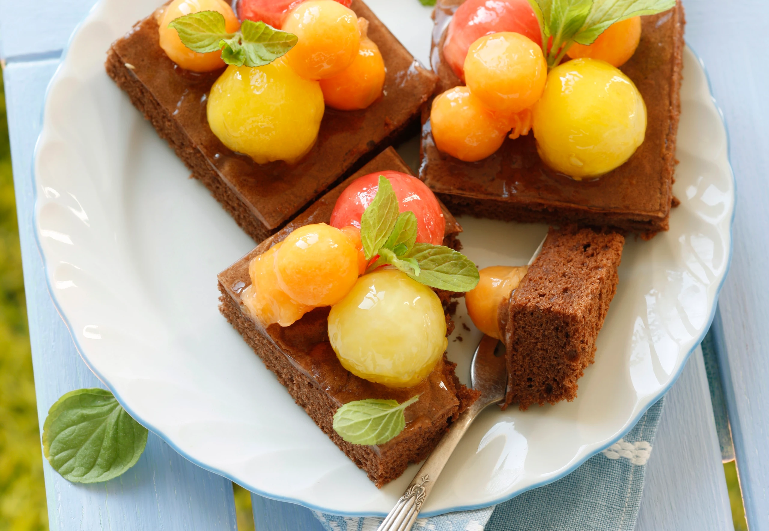 Für die Garnitur mit einem Kugelausstecher aus jeder Melone Kugeln ausstechen. Gelee nach Anleitung zubereiten. Kuchen portionieren, Melonenkugeln darauf verteilen und mit Gelee bestreichen. Kuchen mit Minze garnieren.