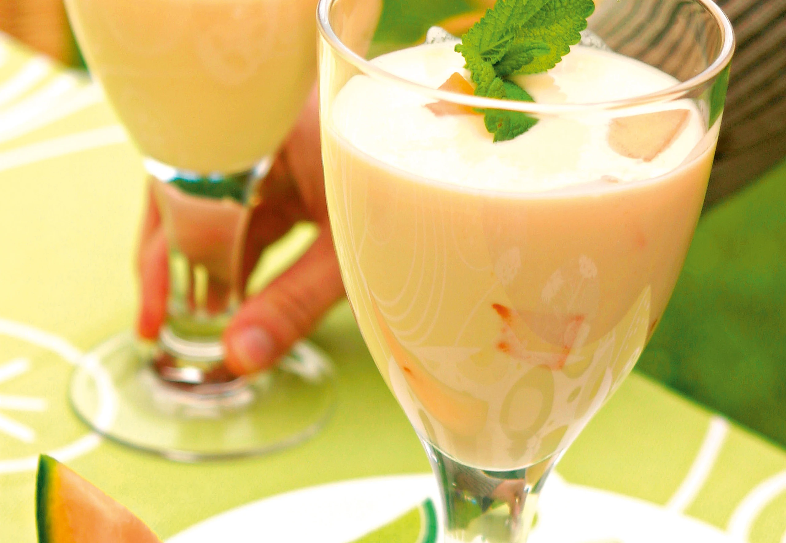 Etwas Melonenfruchtfleisch für die Einlage in Würfel schneiden. Restliches Fruchtfleisch und übrige Zutaten mixen, Melonenwürfel zugeben.