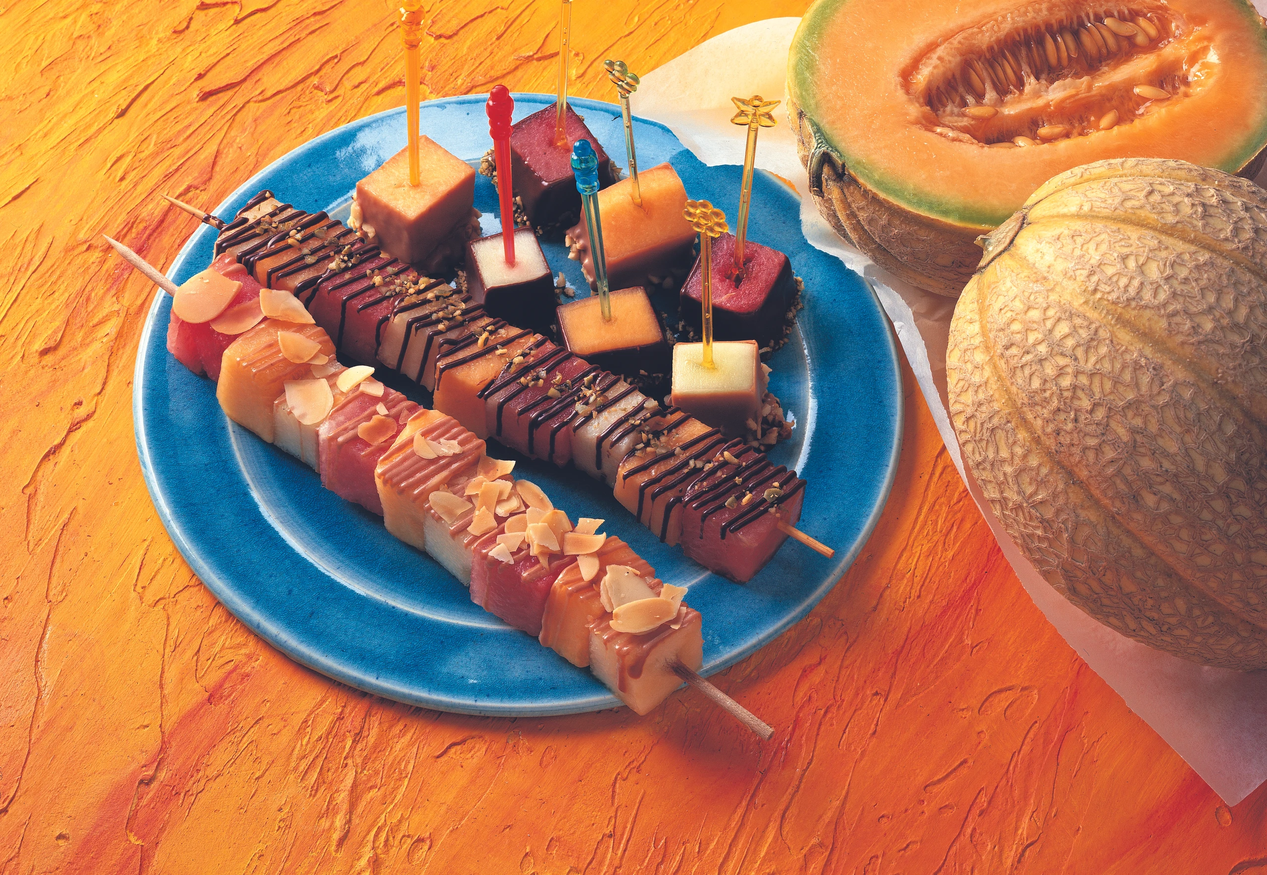 Melonen-Spieße mit Schokolade und Nüssen