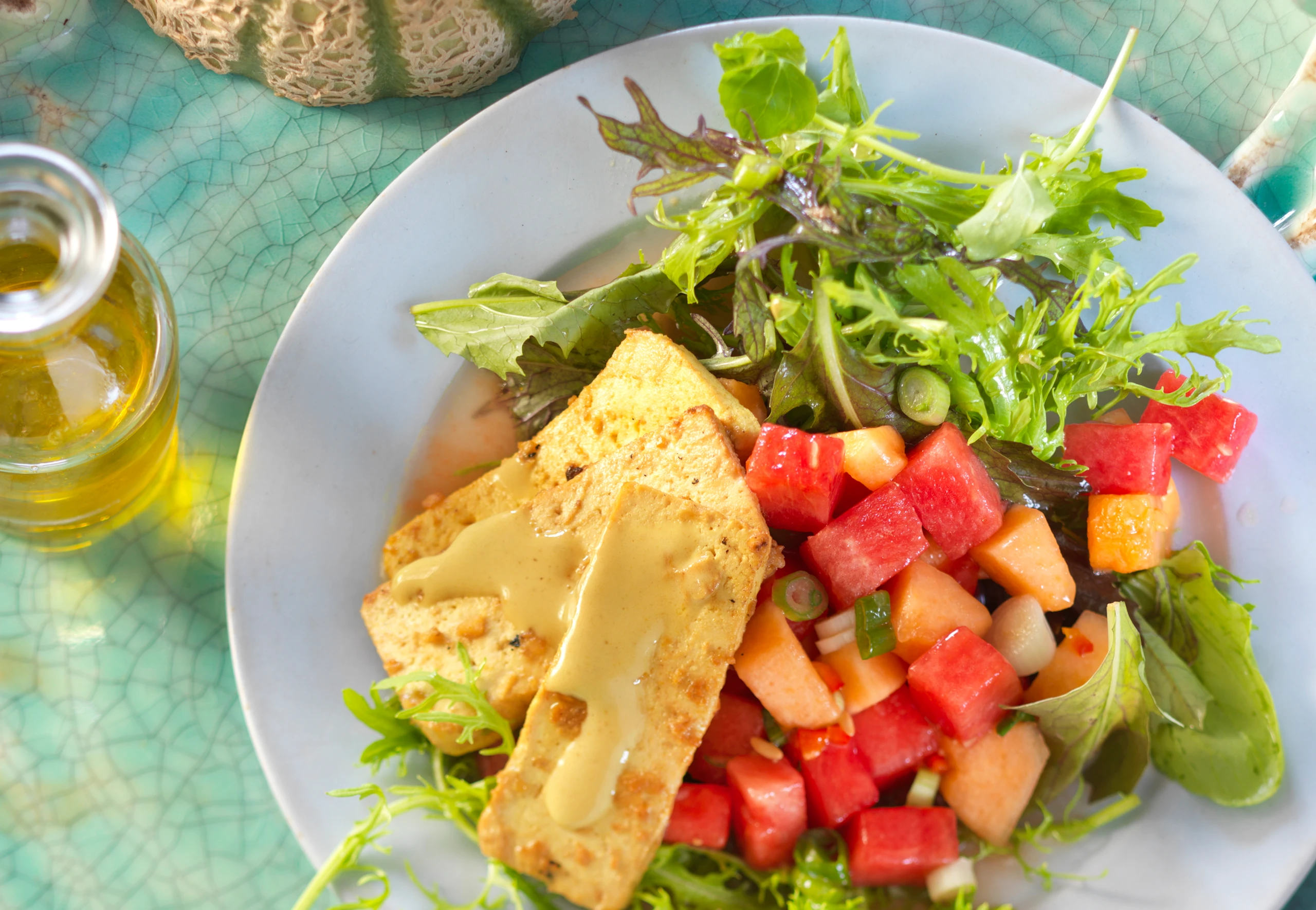 Limettensaft mit Basilikum und Öl verrühren, Melonen und Jungzwiebeln untermischen. Salat mit Salz und Chili würzen. Blattsalate mit Melonensalat und Tofu anrichten. Tofu mit Kokos-Currysauce beträufeln.