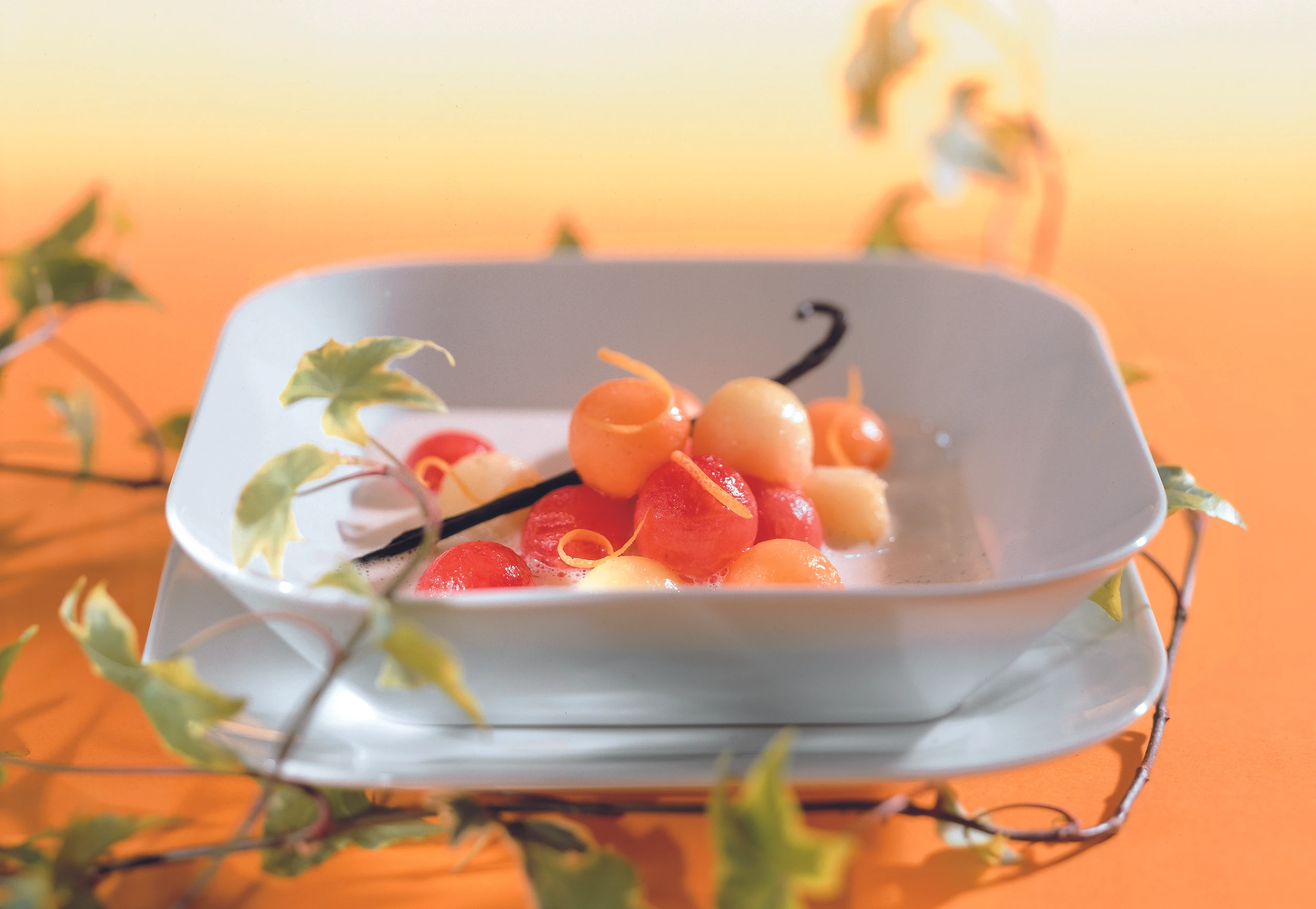Vor dem Servieren Sauce mit Rum verrühren und mit einem Stabmixer aufschlagen. Melonen untermischen, kurz ziehen lassen und anrichten.