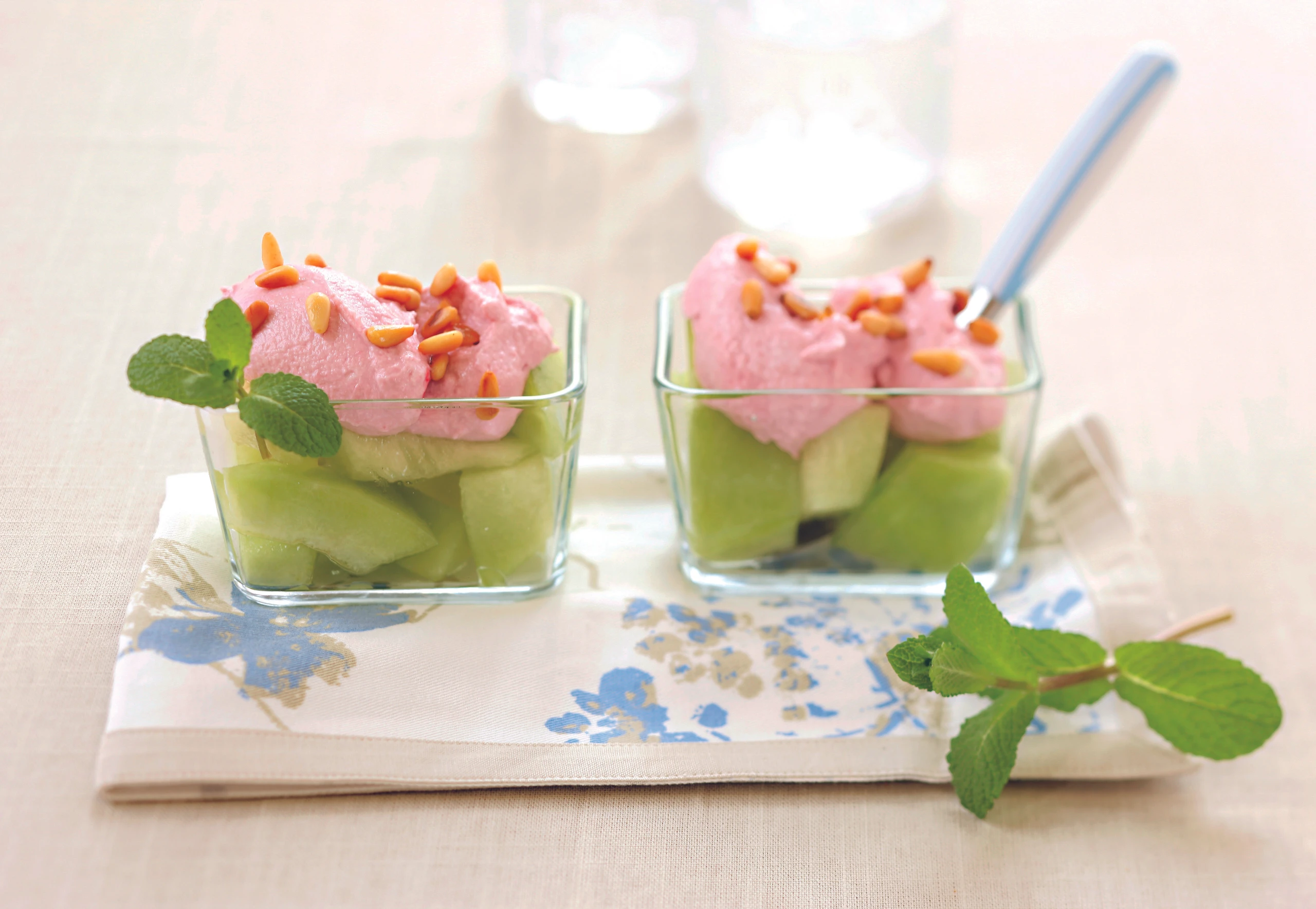 Melonen mit der Creme in Gläsern anrichten, mit Pinienkernen bestreuen und mit Minze garniert servieren.