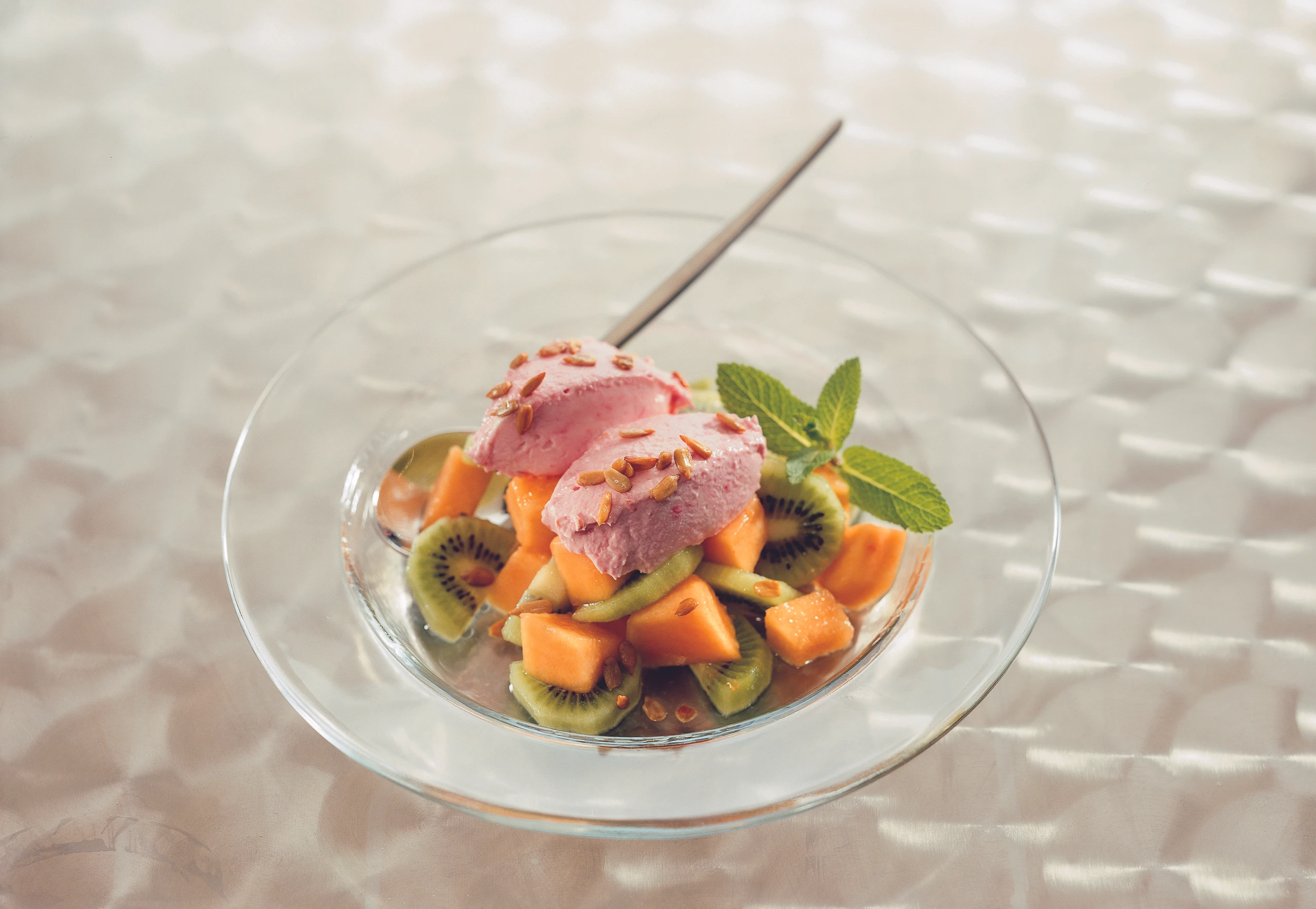 Melonen und Kiwis anrichten, aus der Creme Nocken ausstechen und darauf legen. Dessert mit Sonnenblumenkernen bestreuen und mit Minzeblättern garnieren. Dazu passen Vollkorn-Biskotten.