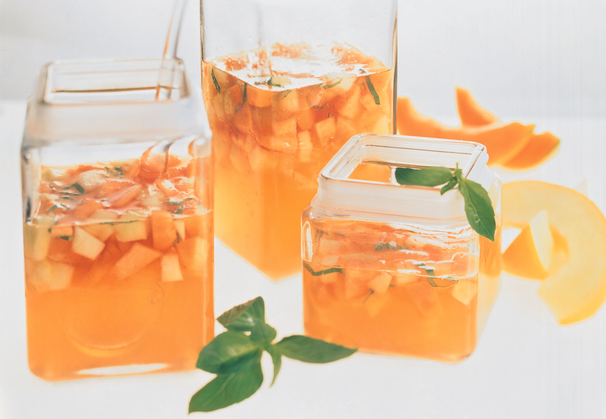 Wein mit Portwein, Tee, Orangenlikör, Zucker und Basilikum verrühren. Melonenstücke untermischen. Bowle mit Frischhaltefolie zudecken und ca. 5 Stunden kühlen.