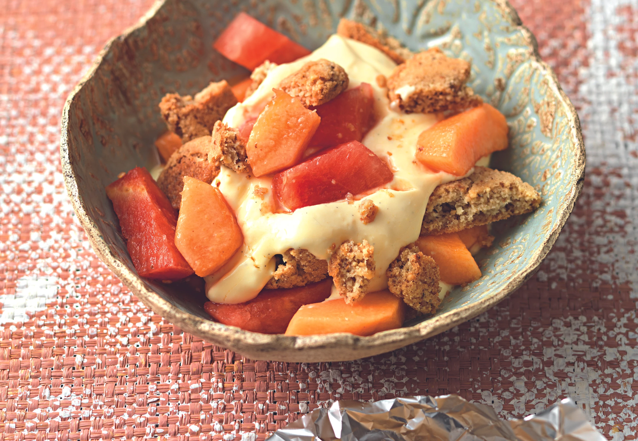 Melonen entkernen und klein schneiden. Vanillecreme abwechselnd mit Keksstücken und Melonen in Schalen füllen, für ca. 4 Stunden kühl stellen.