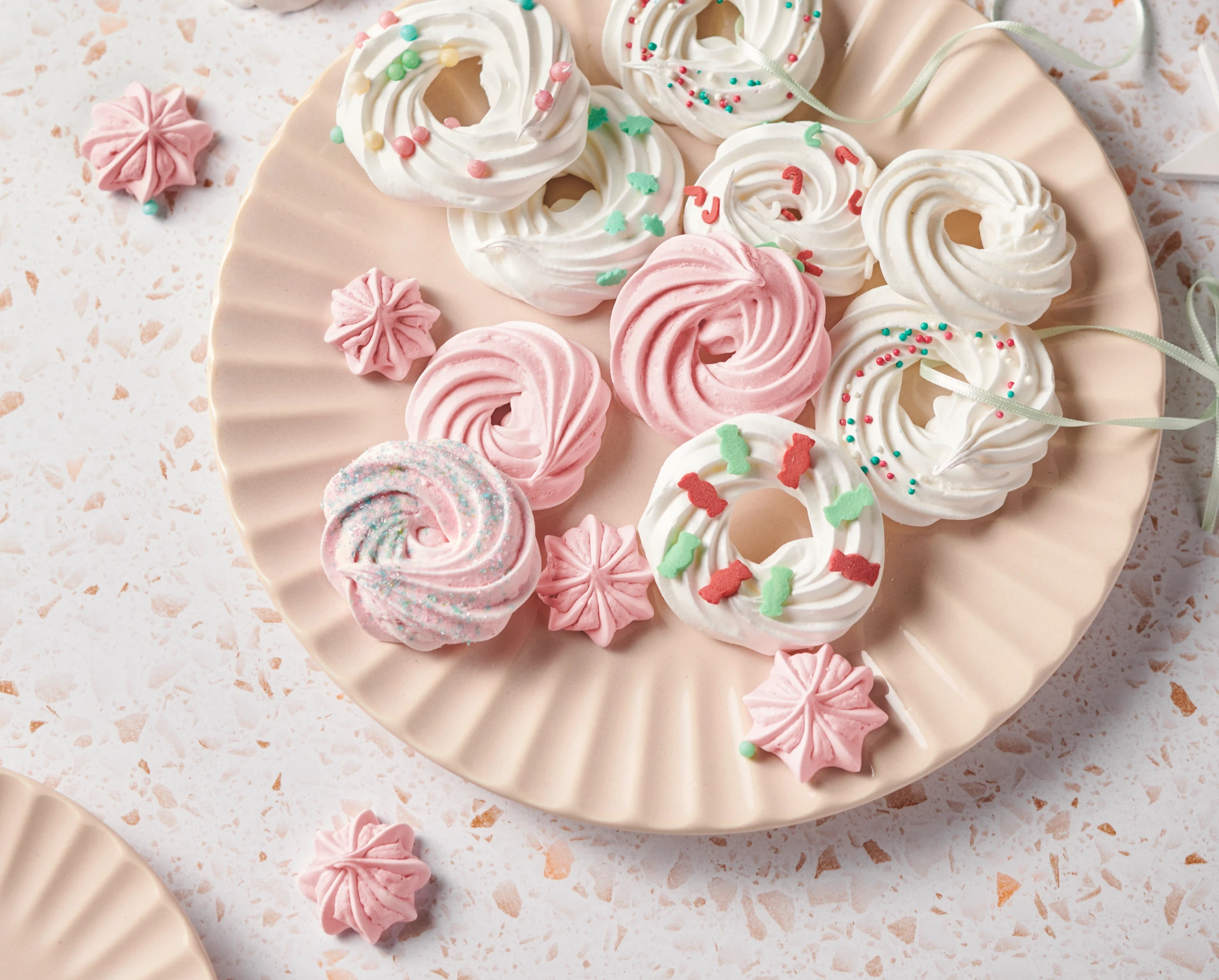 - Meringue in einen Dressiersack mit Sterntülle füllen und Kränze (Ø ca. 8 cm) auf die Bleche dressieren. Mit Streudekor verzieren.