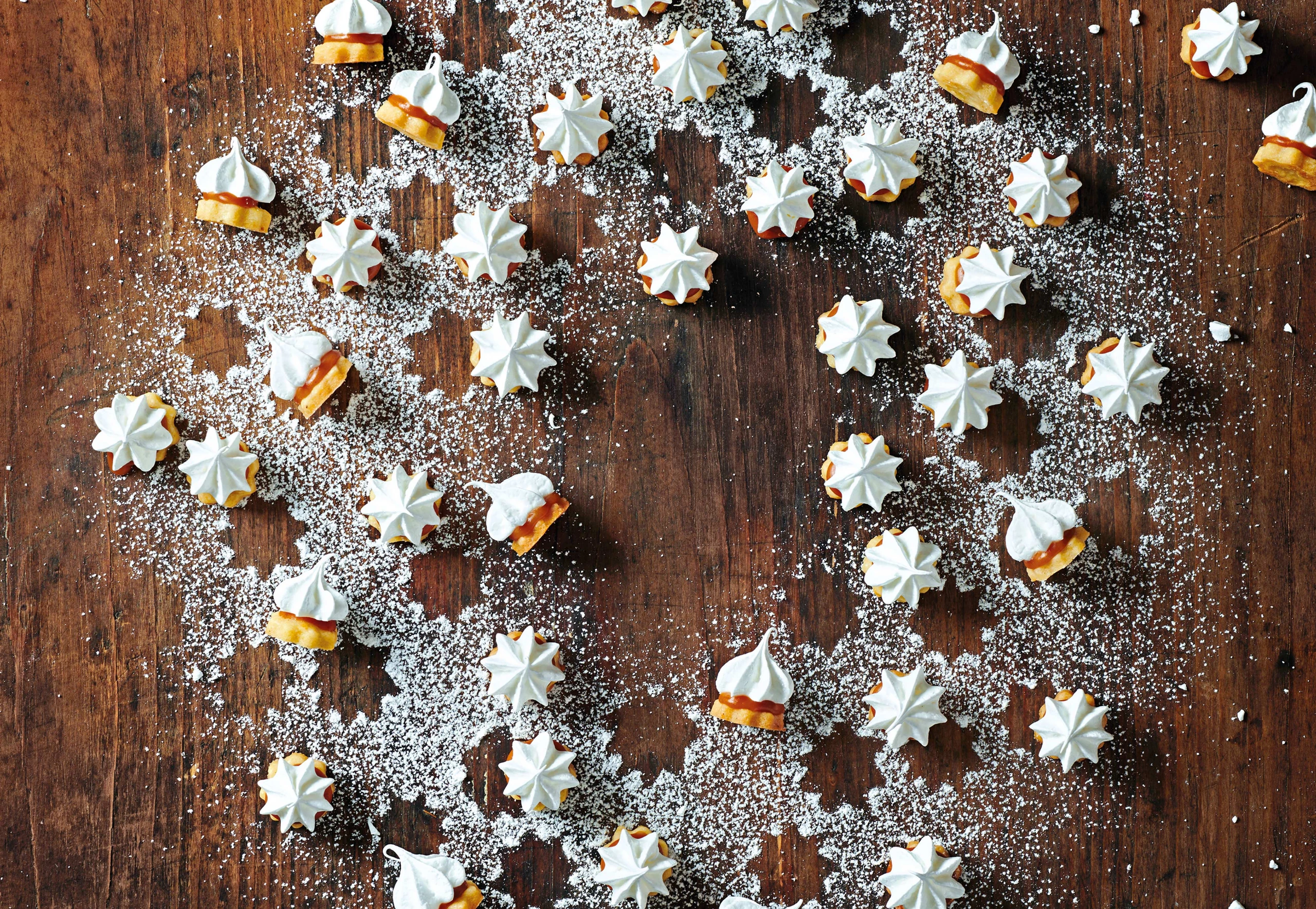 Karamell in einen Dressiersack füllen und kleine Tupfen auf die Kekse dressieren. Meringueküsse daraufsetzen und leicht andrücken.