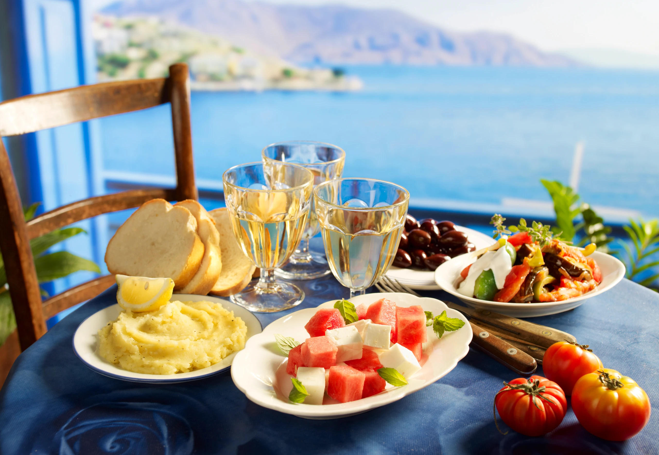 Für die Karpoúzi me feta Wassermelone in Spalten schneiden, entkernen, Fruchtfleisch in Würfel schneiden. Feta in Stücke schneiden. Melone und Feta anrichten, mit Minzeblättchen garnieren. Dazu passen Weißbrot und Oliven.