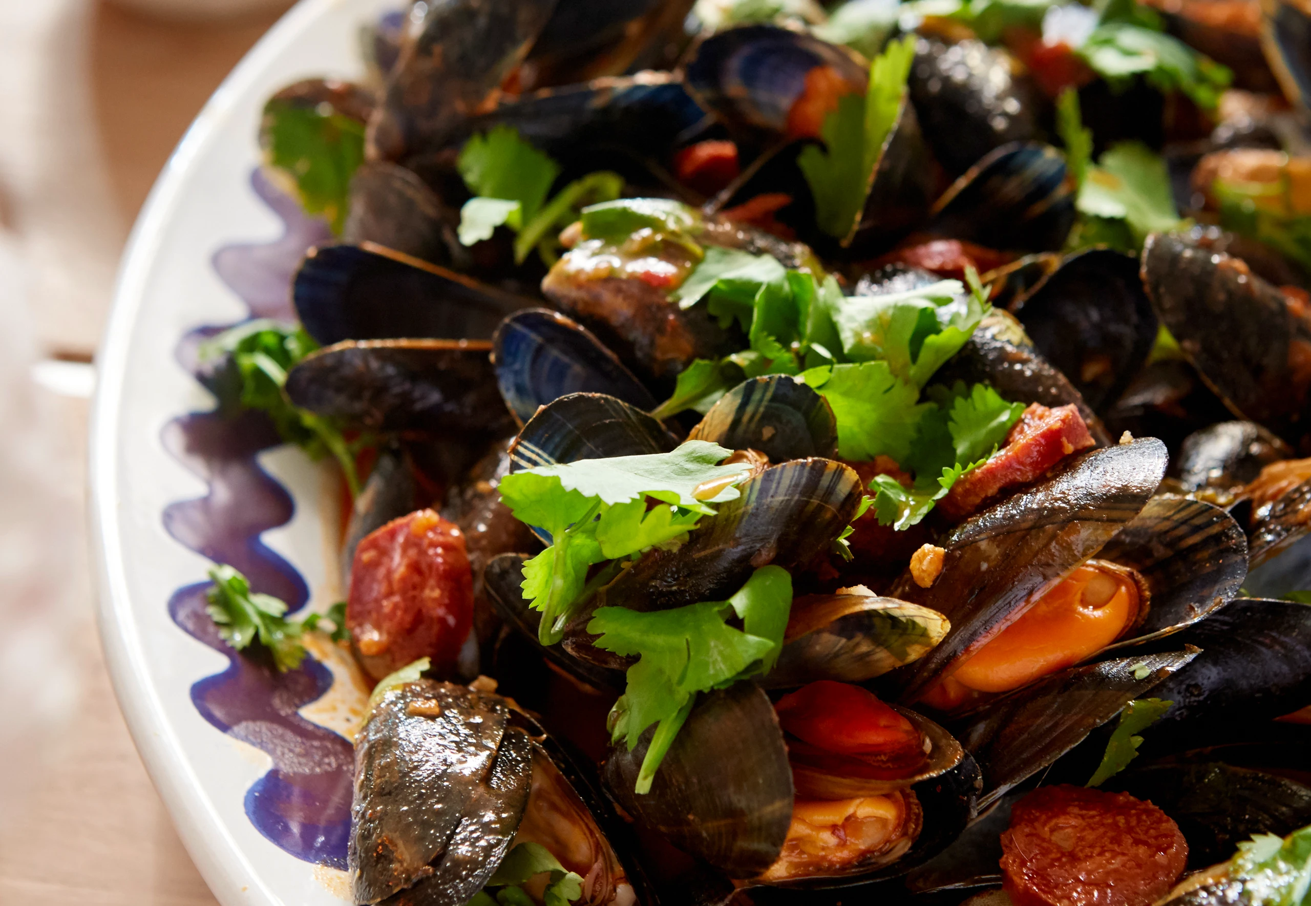 Passata, Chili, 2 EL vom Koriander und Muscheln zugeben und ca. 8 Minuten zugedeckt köcheln. Ungeöffnete Muscheln entfernen.