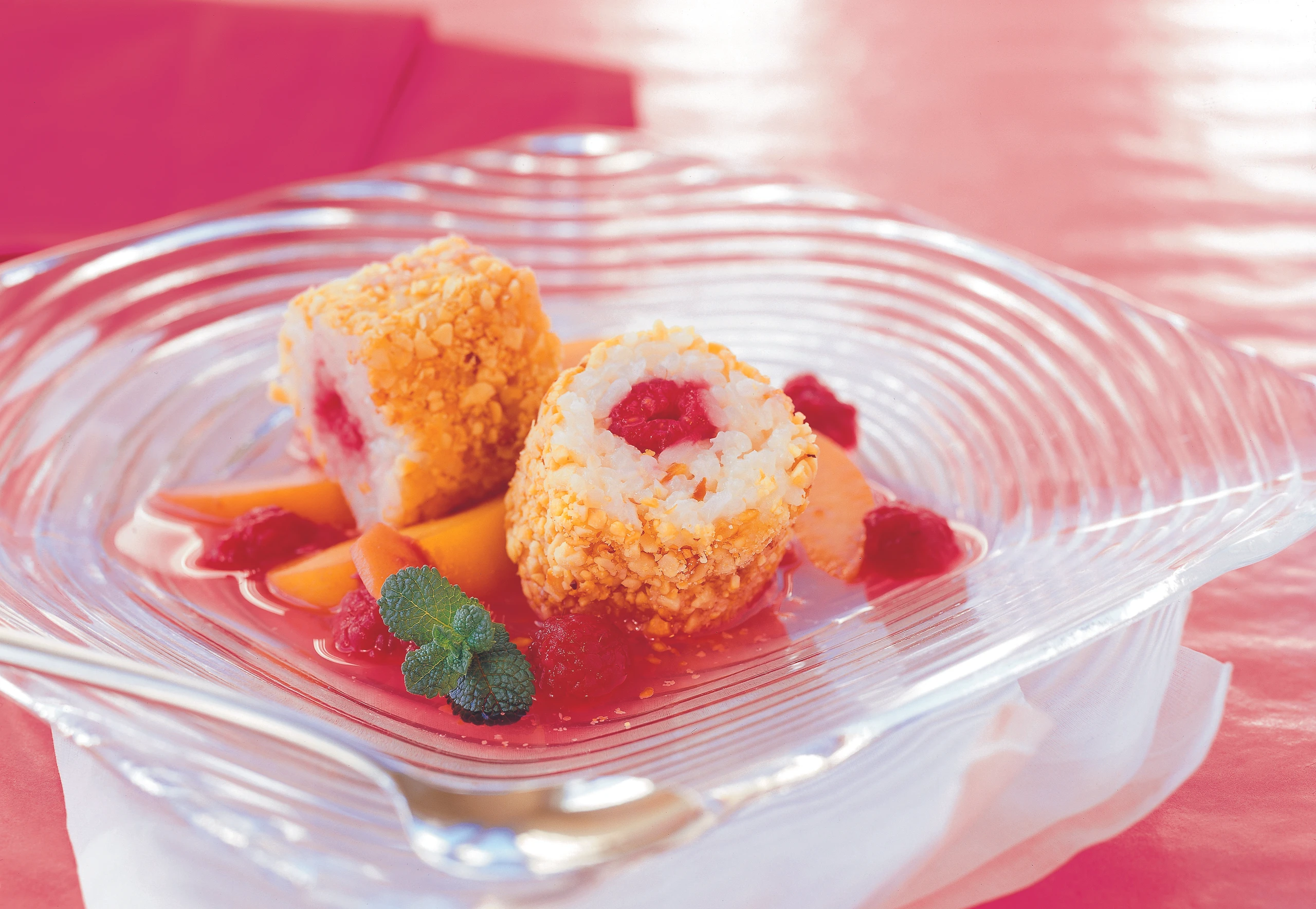Milchreis-Himbeer-Sushi im Erdnussmantel