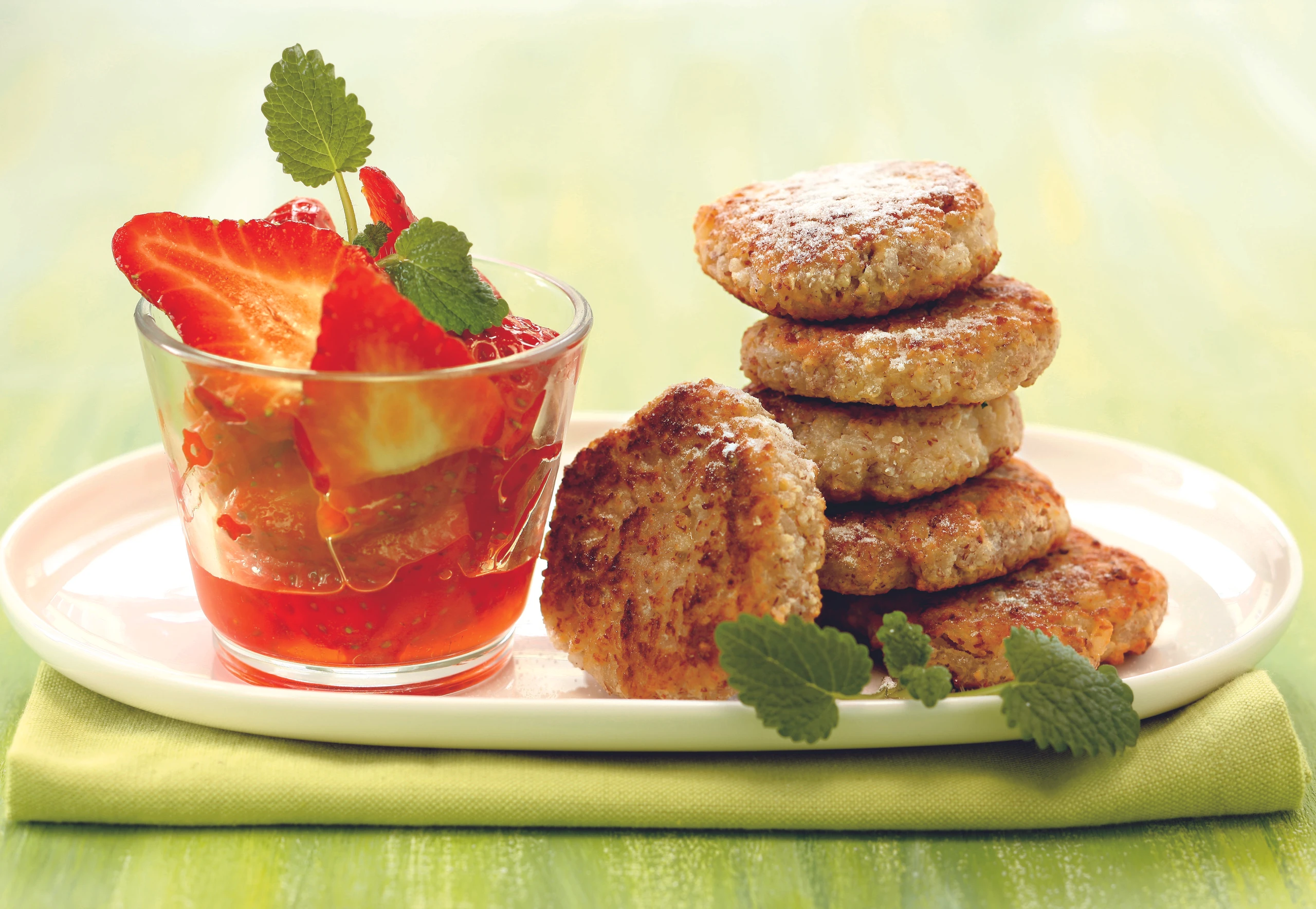 Laibchen mit Staubzucker bestreuen und mit dem Erdbeersalat servieren.