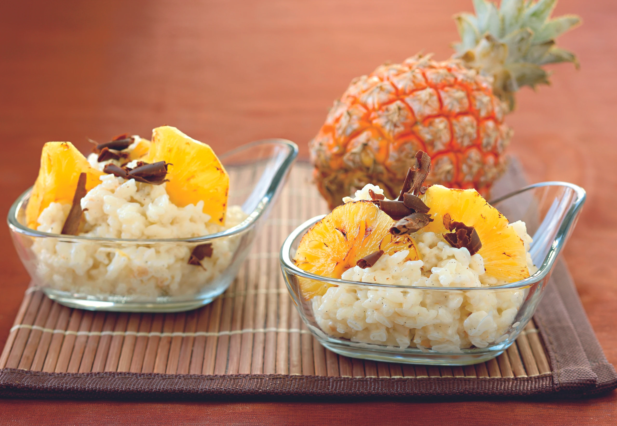 - Ananas schälen, in 6 Scheiben schneiden, Strunk ausstechen. Butter erhitzen, Ananas darin beidseitig braten und auf Küchenpapier abtropfen lassen. Milchreis mit Ananas anrichten und mit Schokolade garniert servieren.