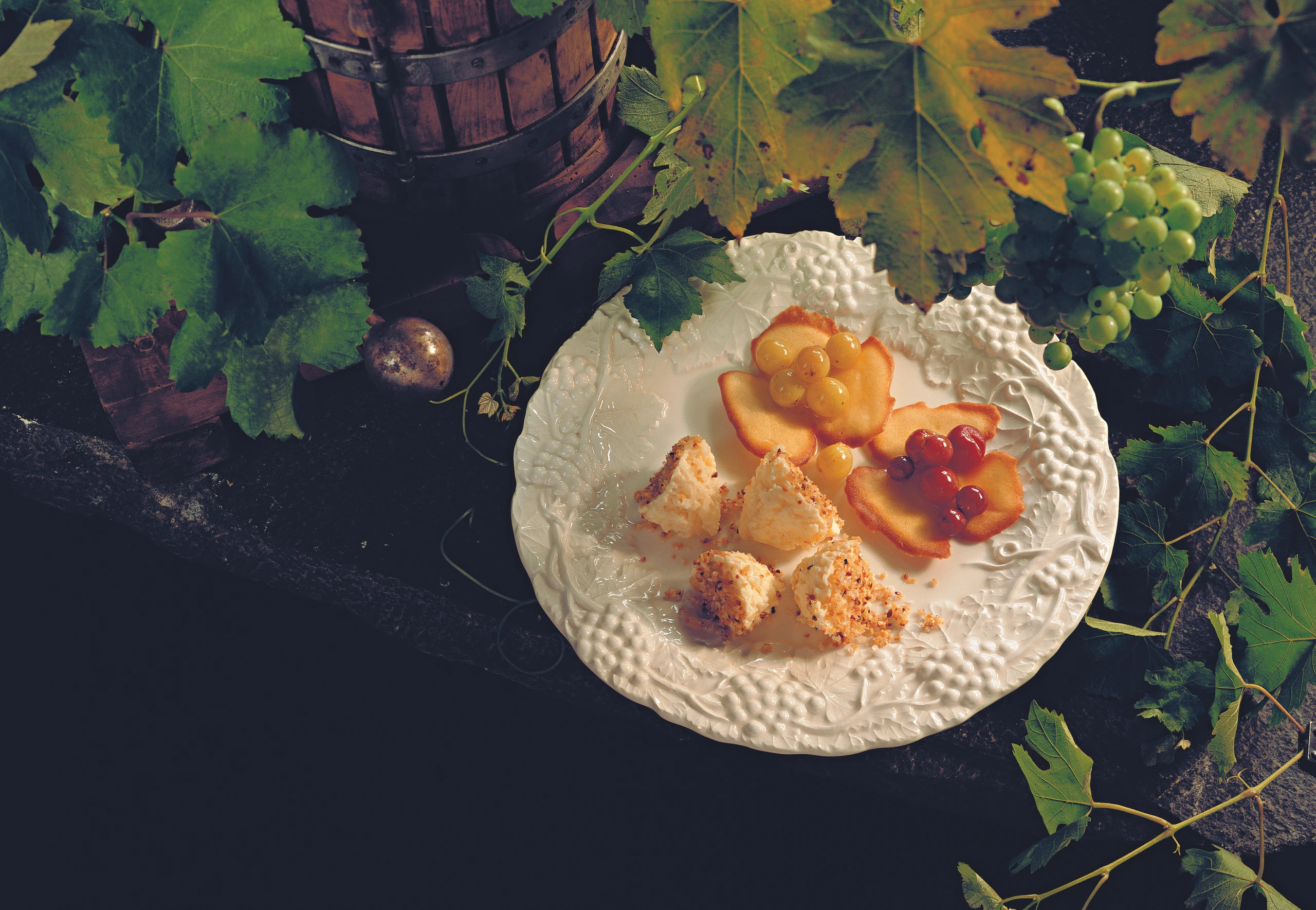 Weintrauben abzupfen, waschen und gut abtropfen lassen. Kristallzucker in Butter anschwitzen, Trauben zugeben und unter behutsamem Rühren anbraten. Trauben in eine Schüssel füllen, abkühlen lassen und in den Hippenblättern anrichten.