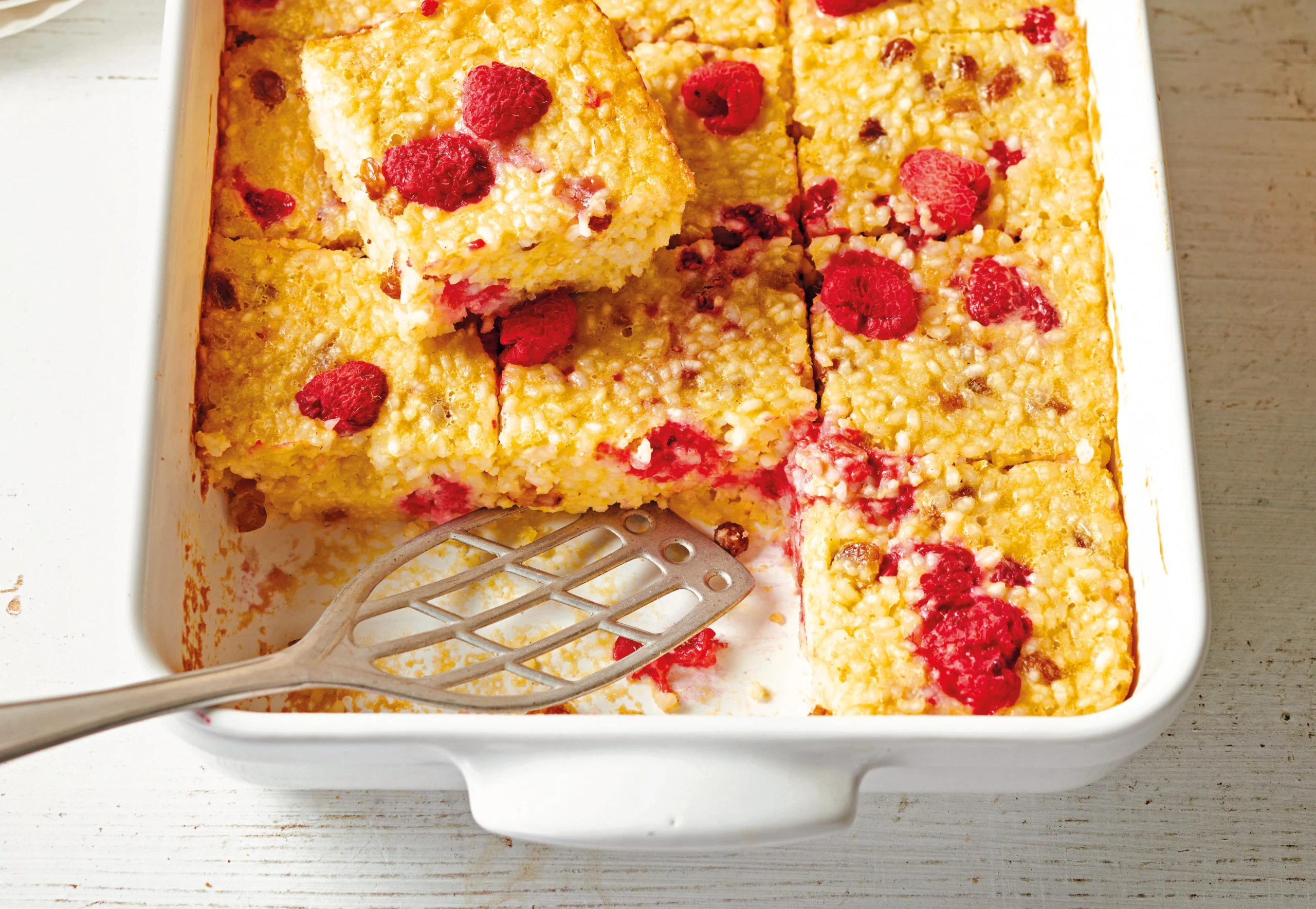 Milchreisschnitte mit Himbeeren