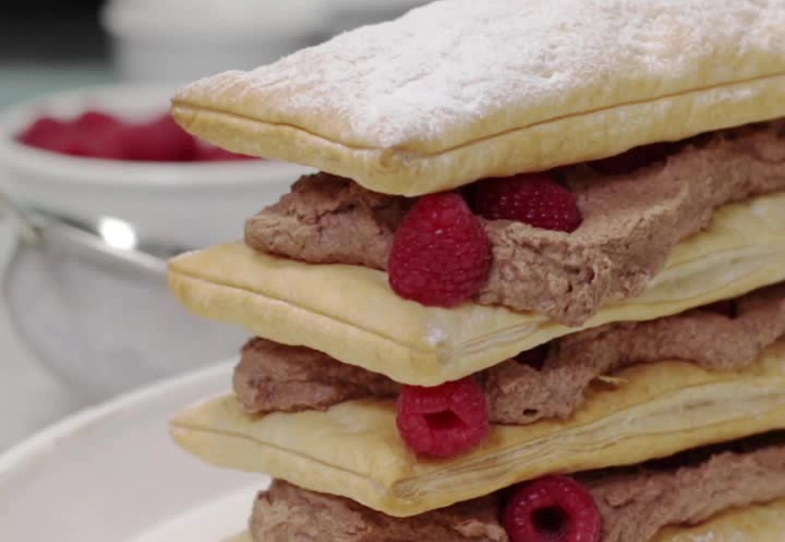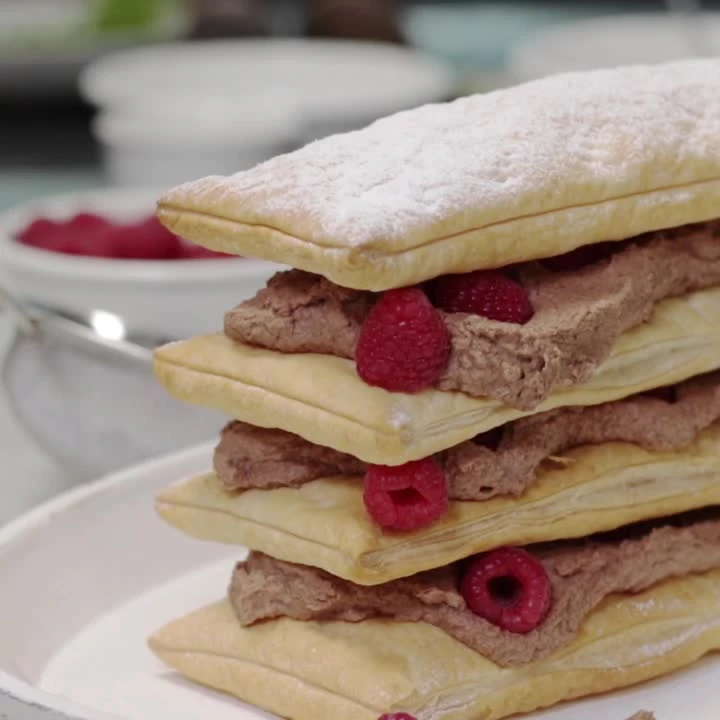 - Blätterteig-Streifen mit Creme und Himbeeren füllen. Mille-feuille mit Staubzucker bestreuen.