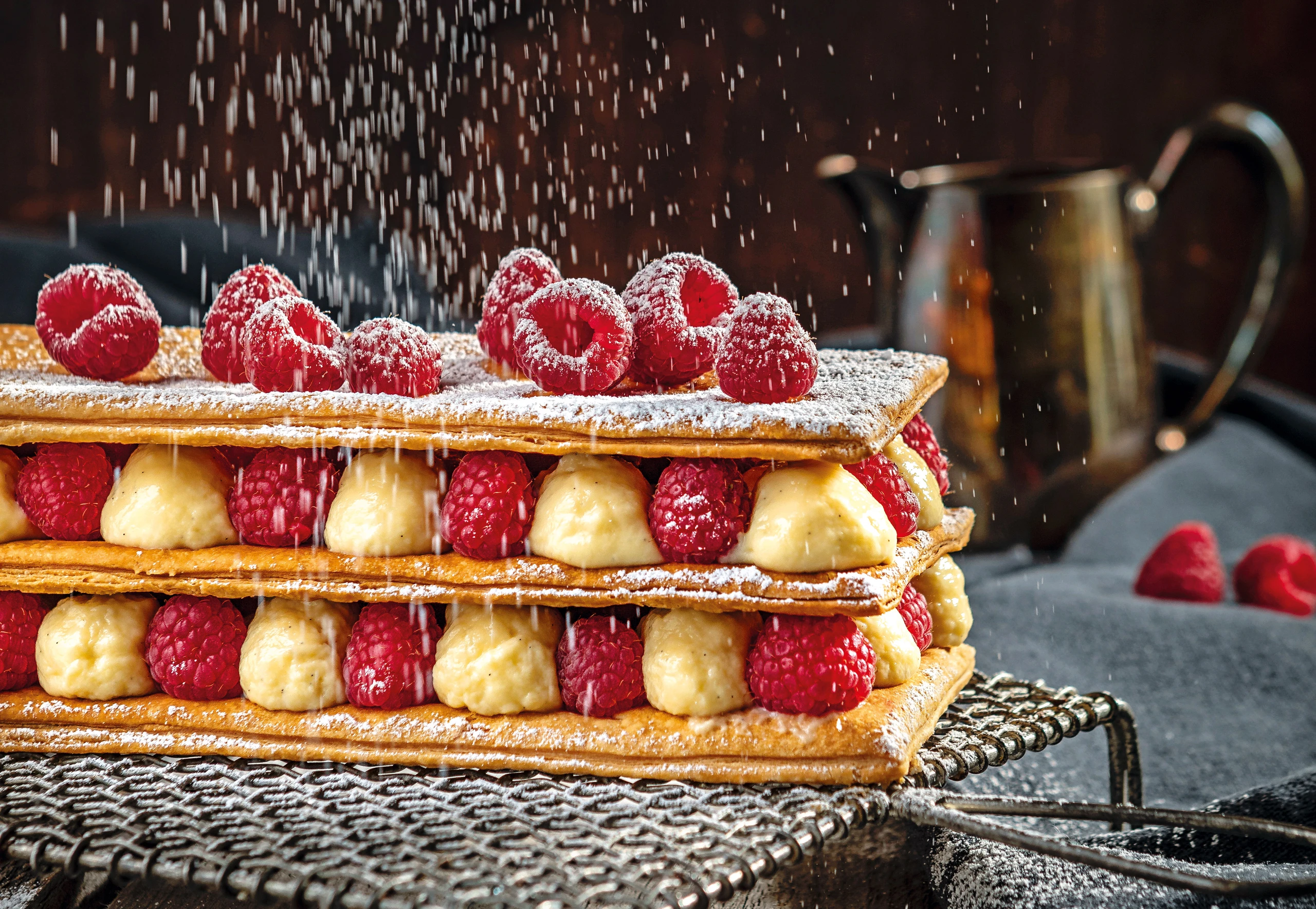 Creme in einen Dressiersack mit Lochtülle füllen, Tupfen auf 2 Blätterteigstücke dressieren und mit Himbeeren belegen. Streifen übereinanderlegen, dritten Streifen daraufgeben, mit Himbeeren dekorieren und mit Staubzucker bestreuen.