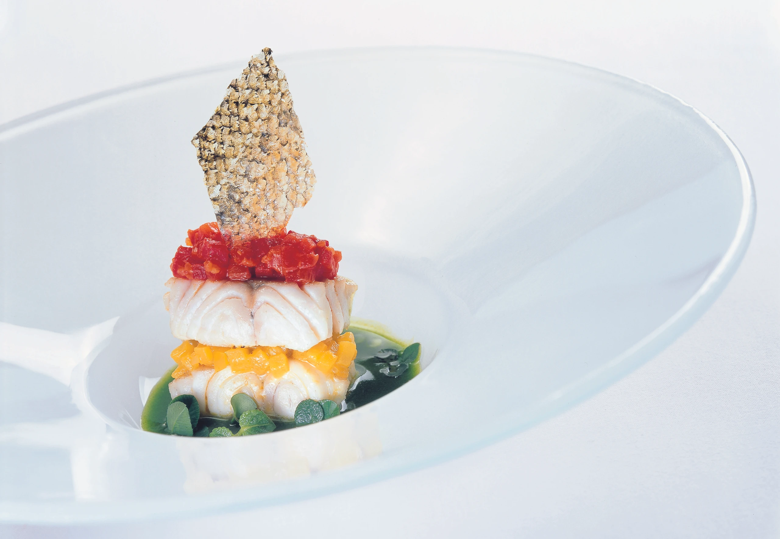 Mille feuilles von Zander und Paprika im Rotklee-Kräuter-Fond