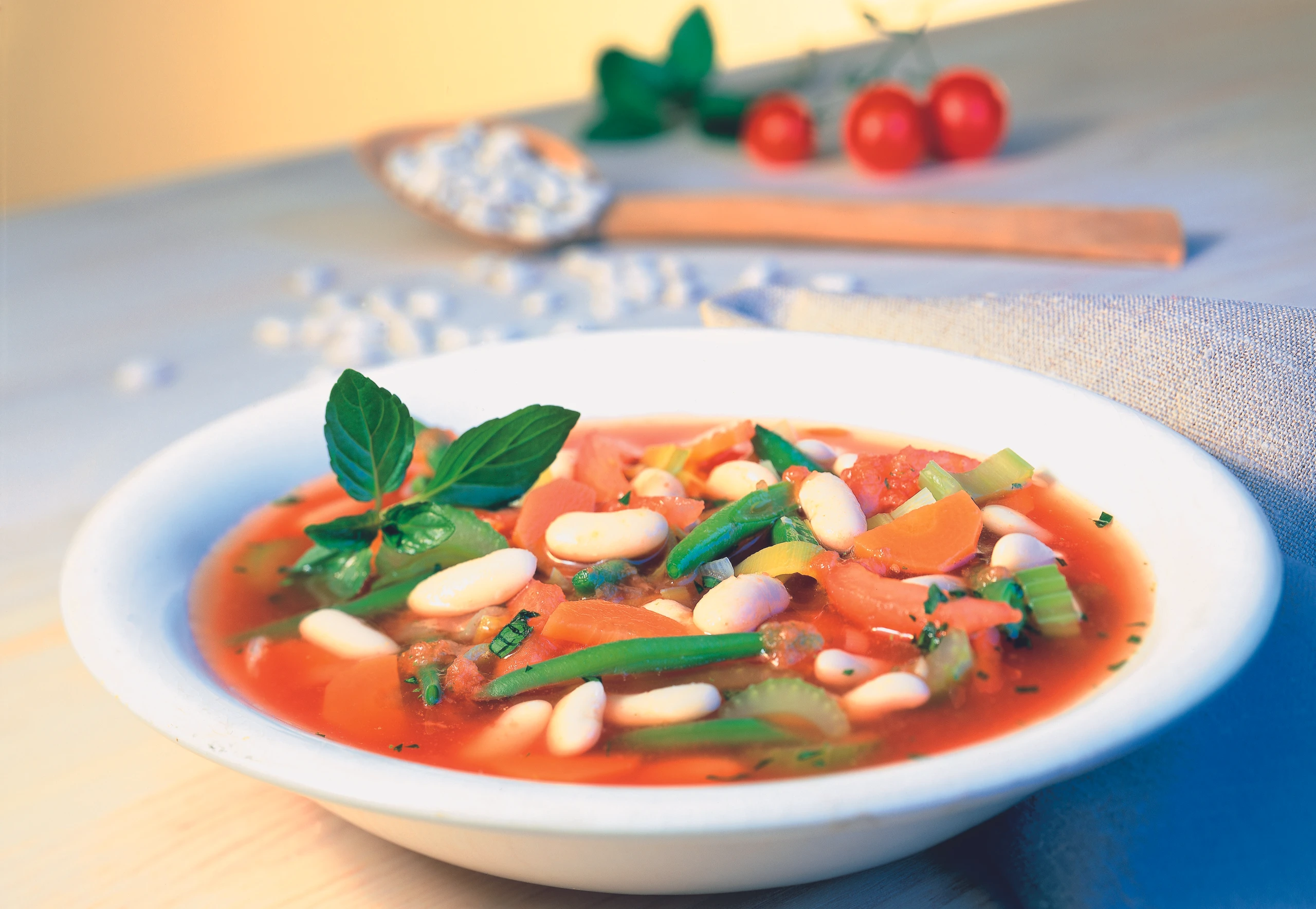Minestrone mit Gemüsesuppe würzen. Fisolen und Karotten dazugeben, zugedeckt 5 Minuten leicht kochen. Sellerie und Lauch zugeben, zugedeckt 5 Minuten leicht kochen. Paradeissauce unterrühren und 3 Minuten leicht kochen.