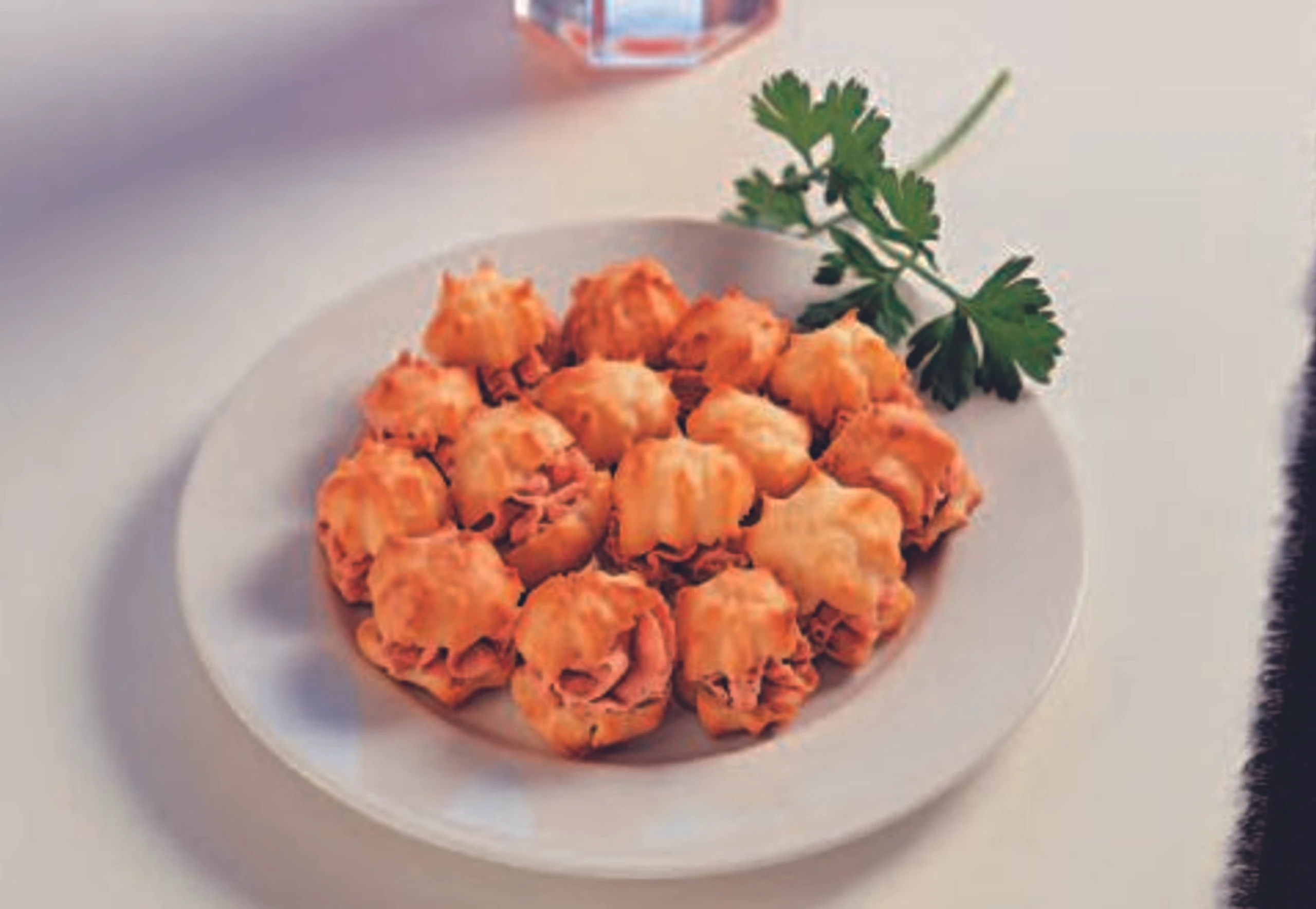 Backrohr auf 180 °C vorheizen. Backblech mit Backpapier belegen. Brandteig in einen Dressiersack mit Sterntülle (Ø ca. 1 cm) füllen, kleine Tupfer auf das vorbereitete Backblech dressieren und im vorgeheizten Rohr (mittlere Schiene) ca. 15 Minuten backen.