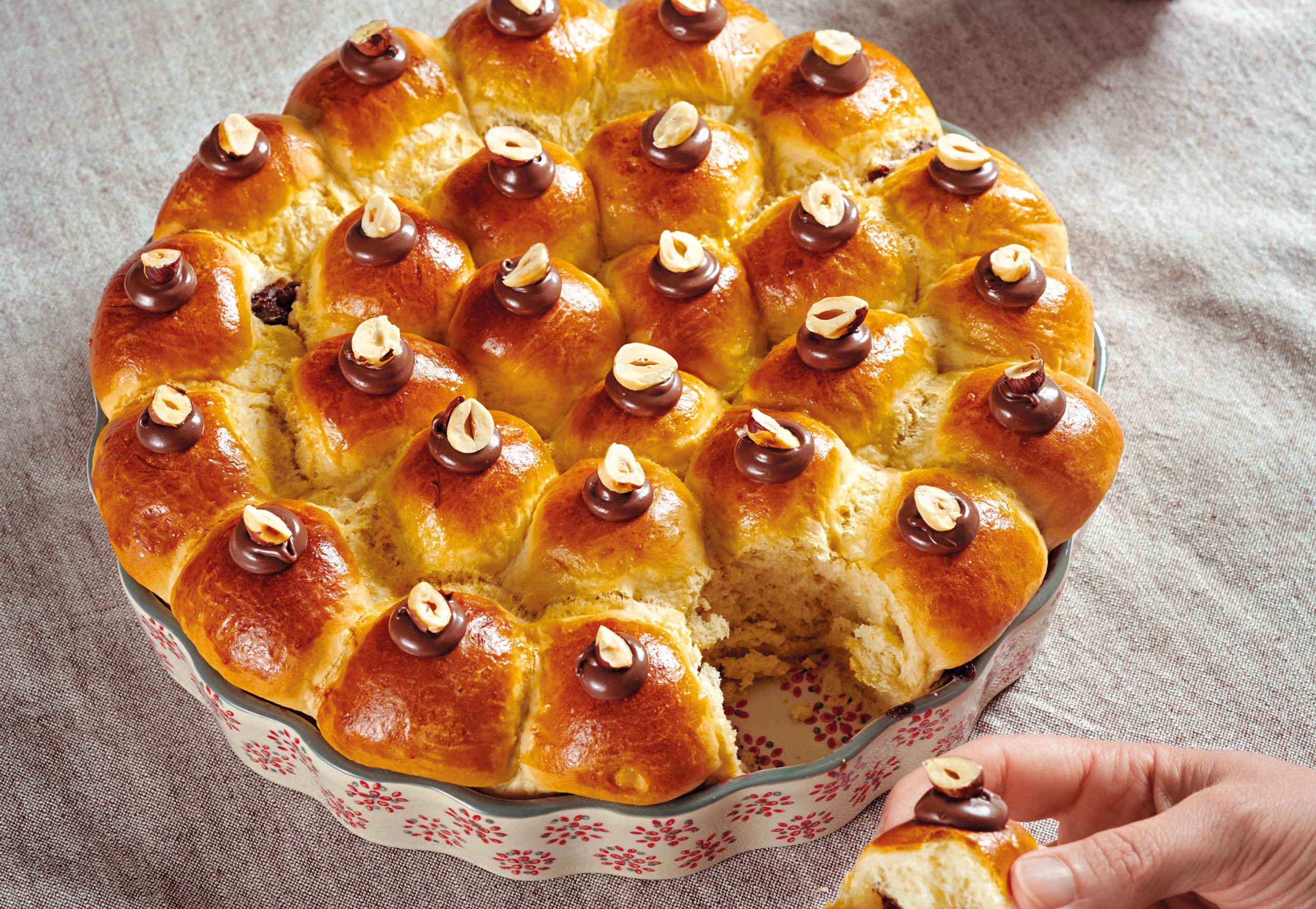 Buchteln mit einem Tupfer Schokocreme und Haselnüssen verzieren.